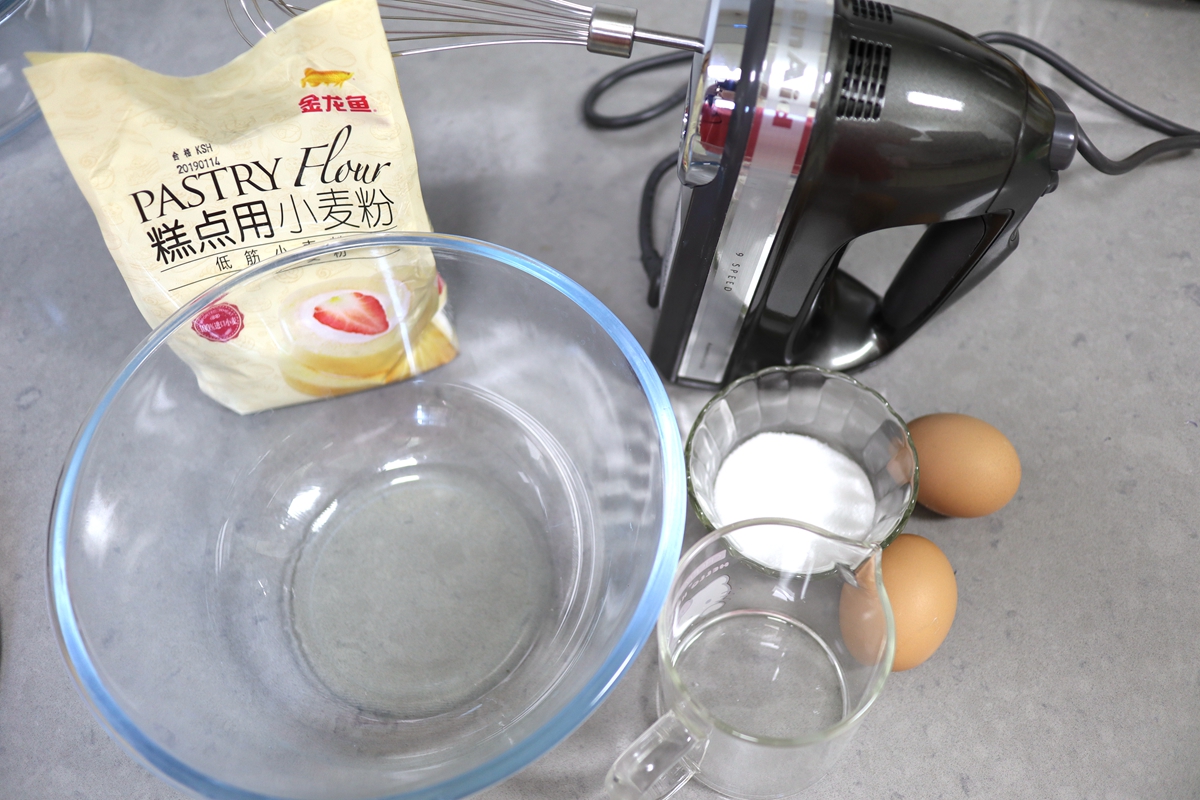 材料:65克带壳鸡蛋2个,金龙鱼低筋面粉45克,蛋白用细砂糖30克,玉米油20克,凉水25克