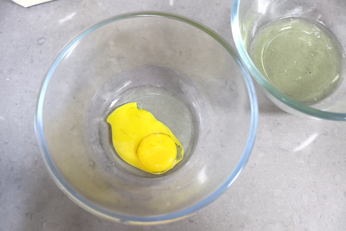 2. 蛋清蛋黄分离,蛋清入无油无水的打蛋盆中,蛋黄入玉米油盆中;