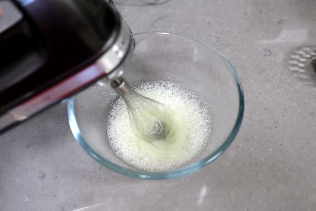 9速打蛋器的最高速9速将蛋清打出粗泡,倒入一半的白糖,继续9速打发;