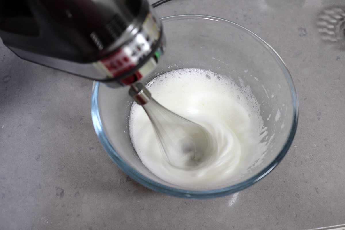 7. 待蛋清变成细腻的白色发泡时,将剩下的白糖倒入,先9速打发,待感觉到有一点儿阻力且蛋白糊出现明显纹路时,转5速打发;