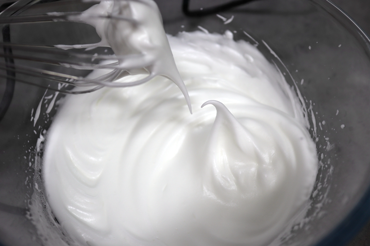8. 纹路越来越明显,蛋白糊有明显光泽时,边关掉打蛋器边提起来,蛋白糊呈现细小的弯钩,打发结束;此时开始预热烤箱,120度上下火;