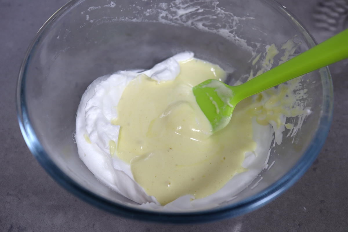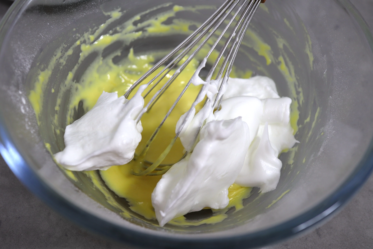 9. 取1/3蛋白糊入蛋黄糊中,用手动打蛋器搅拌均匀;