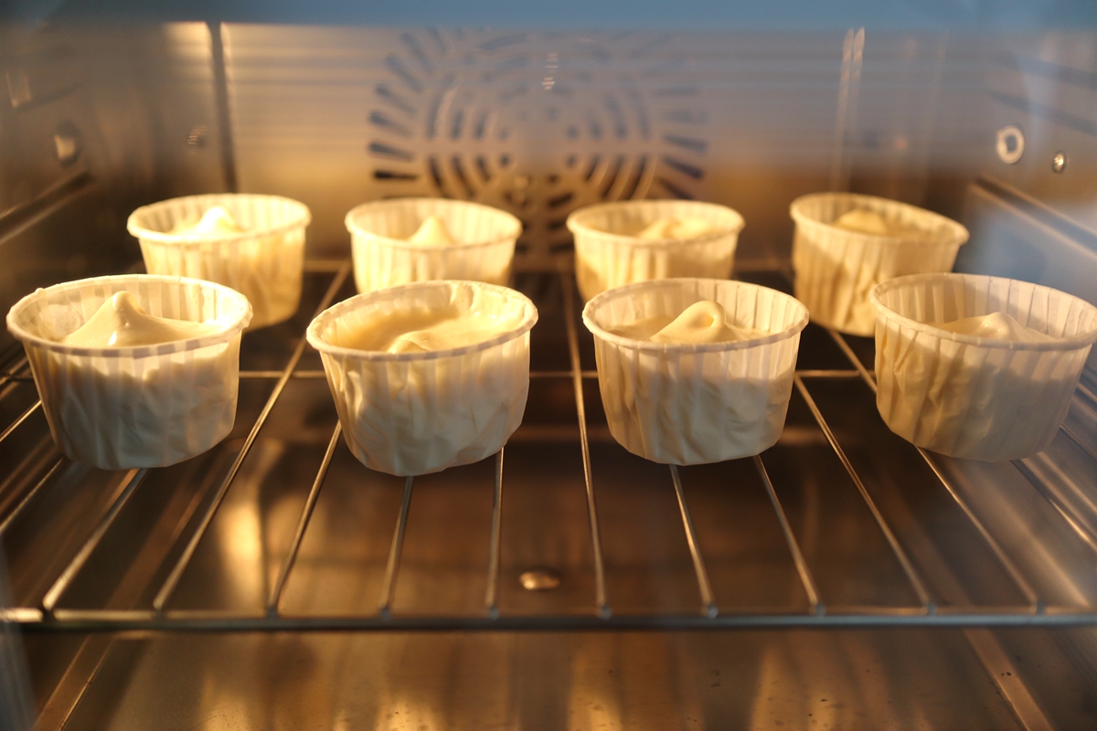 12. 用小勺将蛋糕糊舀入到纸杯中,约8-9个;