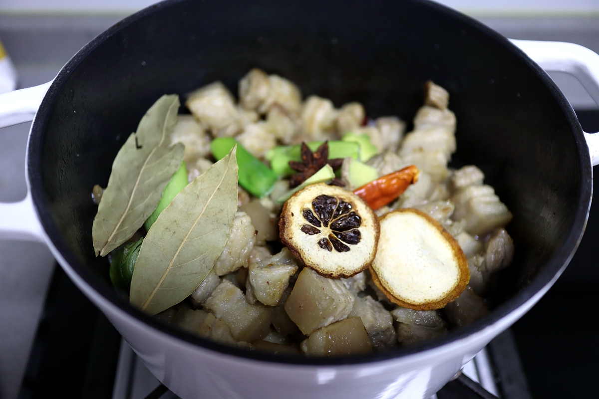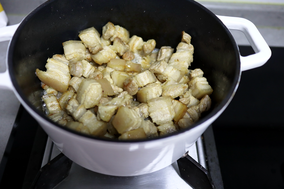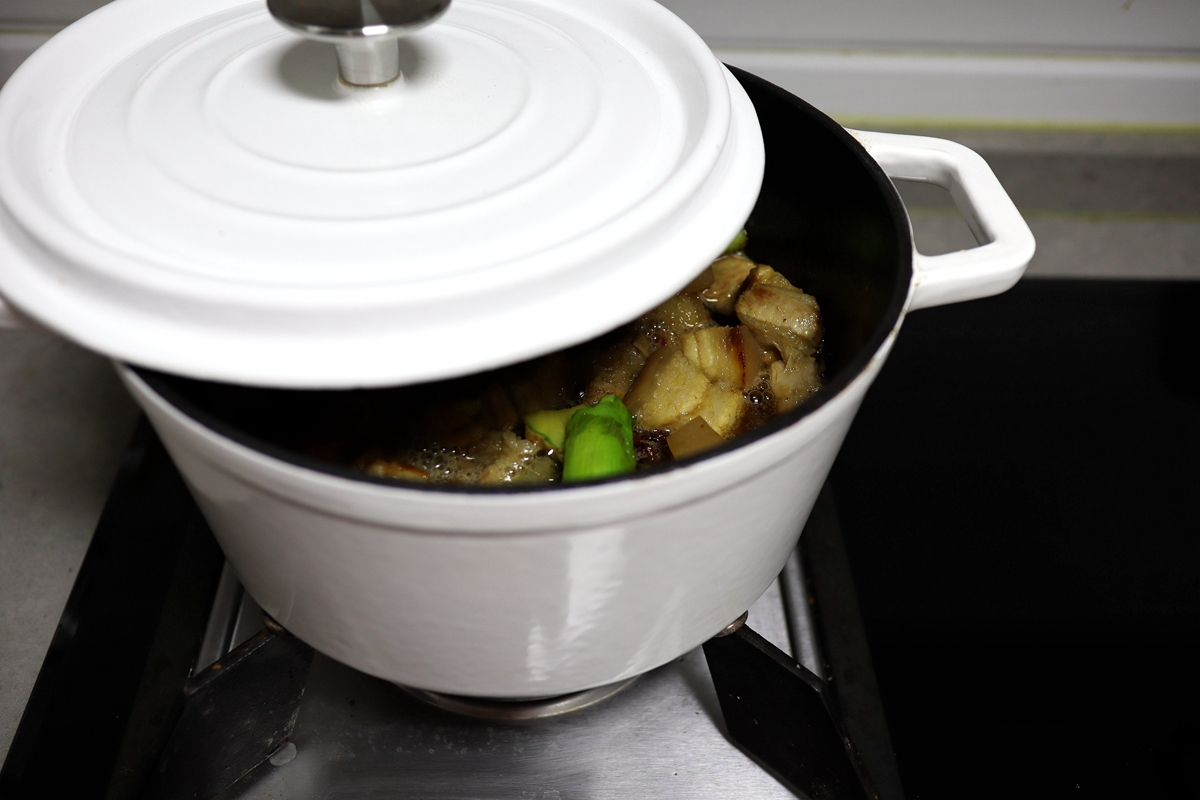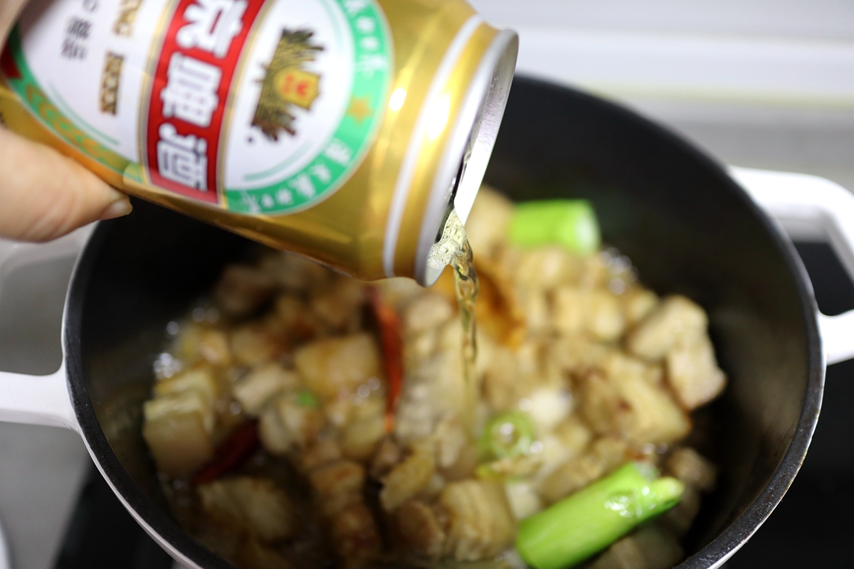 这锅红烧肉没用一滴水,我用了一听啤酒。啤酒是以大麦制成的麦芽和水为主要原料,大米、玉米淀粉等为辅料,添加酒花,经糖化、酵母发酵酿造而成的低酒精度、含有二氧化碳的酿造酒,其营养丰富,含有各种人体所需的氨基酸及多量维生素、矿物质。