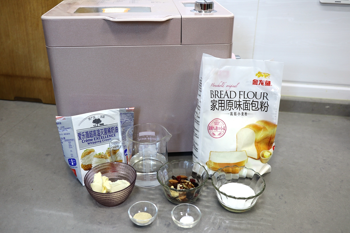 材料:金龙鱼高筋面粉300克,干酵母2.5克,盐3克,白糖40克,淡奶油50克,凉水150克,黄油25克,混合坚果25克