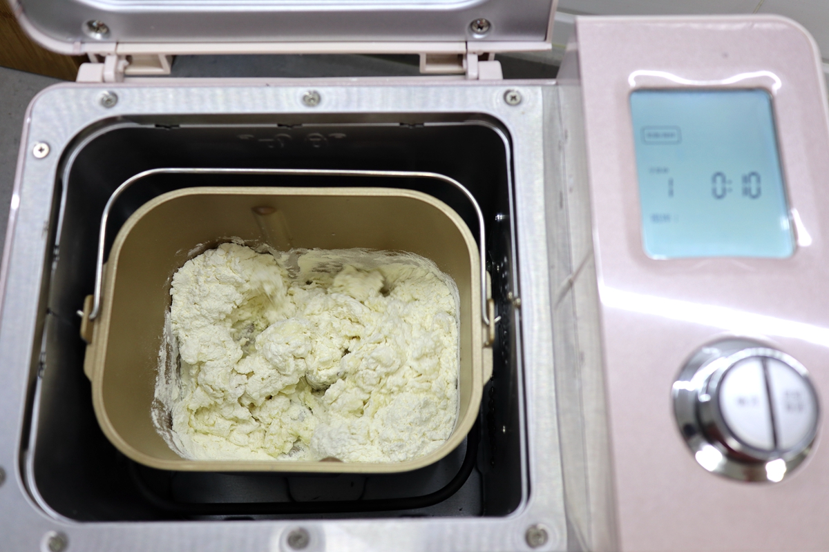 2. 将除黄油和坚果外的所有材料入面包桶中,将桶放入东菱JD08面包机中,启动“揉面”程序10分钟;