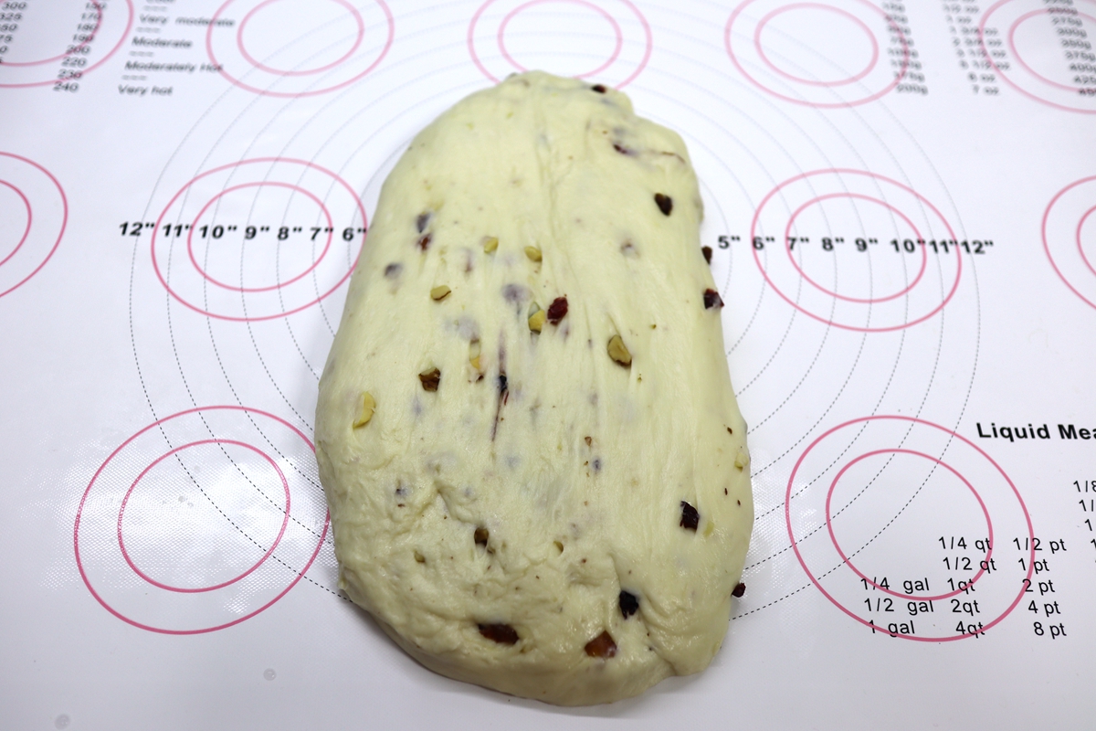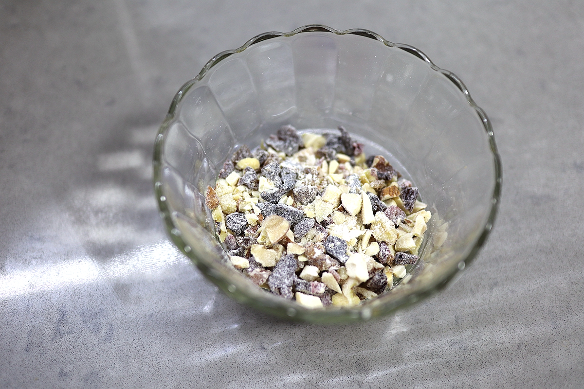 3. 揉面的时候把坚果切碎,撒一点面粉(份量外)备用;