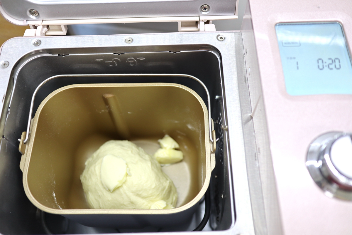 4. 面团揉得光滑且滋润,放入黄油,再次启动“揉面”程序20分钟;