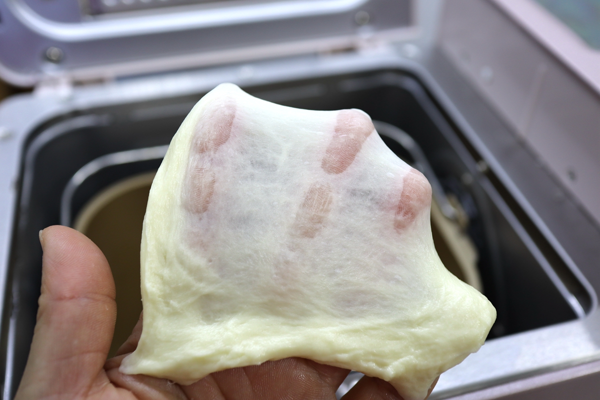 5. 时间到,揪一小块面,轻轻撑开,能出现这种透明且有弹性的薄膜时,揉面结束;由于室内温度过高,酵母已经开始有点作用了,这个面团状态还不是很好,手指一捅,洞口边缘还有少许不光滑,但为了防止酵母的干扰,我就先揉到这儿了,随后的整形可以弥补揉面上的欠缺;