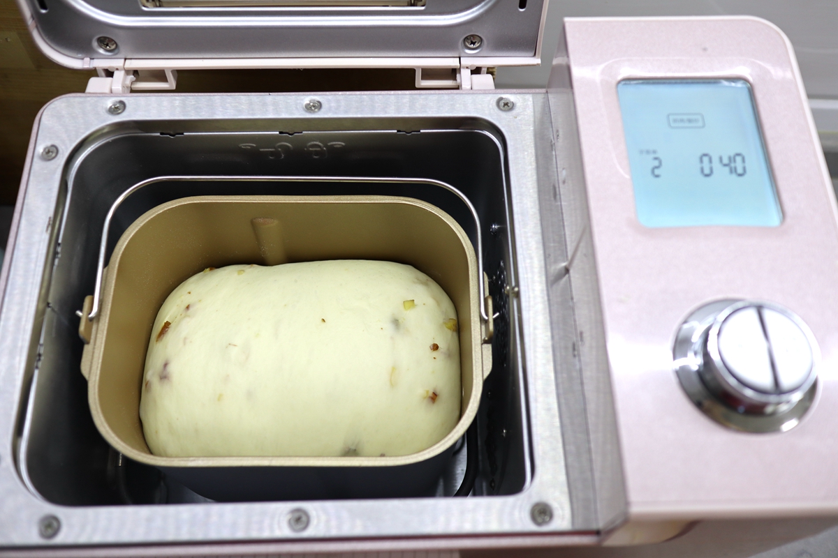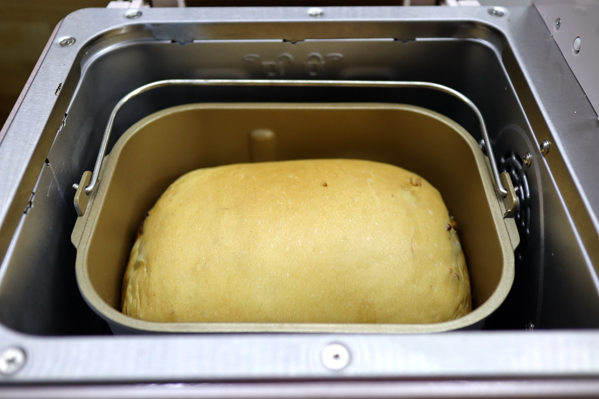 10. 将面卷放入面包桶中,盖上内盖和外盖,选择“发酵”程序1小时,看面团状态来调整时间,我实际用了1小时20分钟;面团是原来的2-2.5倍大小,表面光滑有蓬松感,启动“烘烤”程序,40分钟;