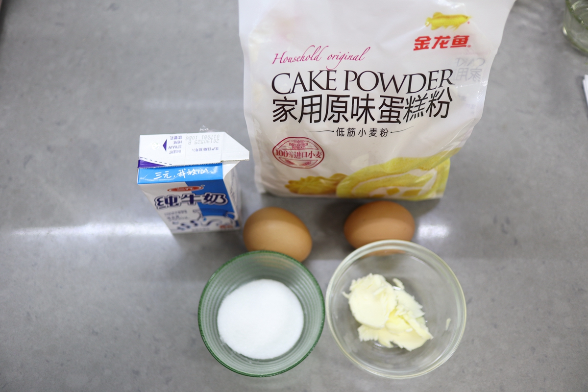材料:65克带壳鸡蛋2个,低筋面粉120克,牛奶100克,黄油20克,细砂糖40克