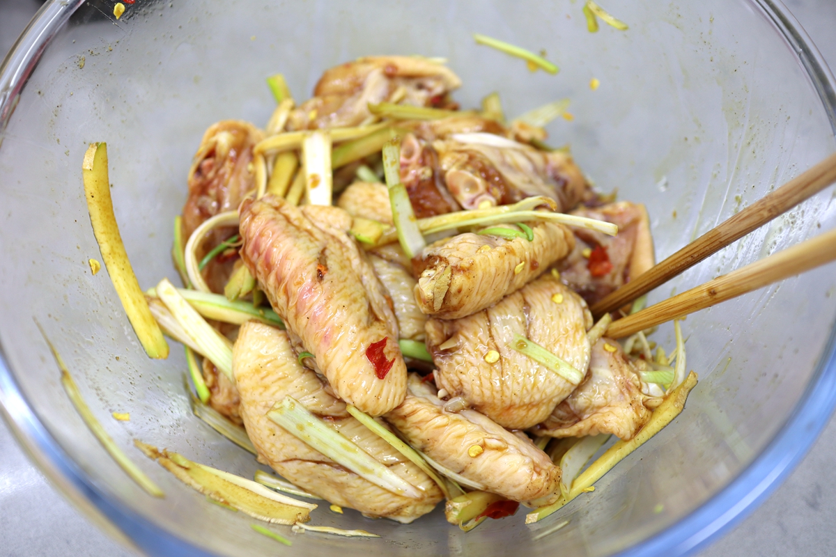 材料:鸡翅中16个,鲜姜1块,大葱半棵,干红辣椒3个,盐3克,生抽30克,蚝油20克,黄酒20克,蜂蜜30克