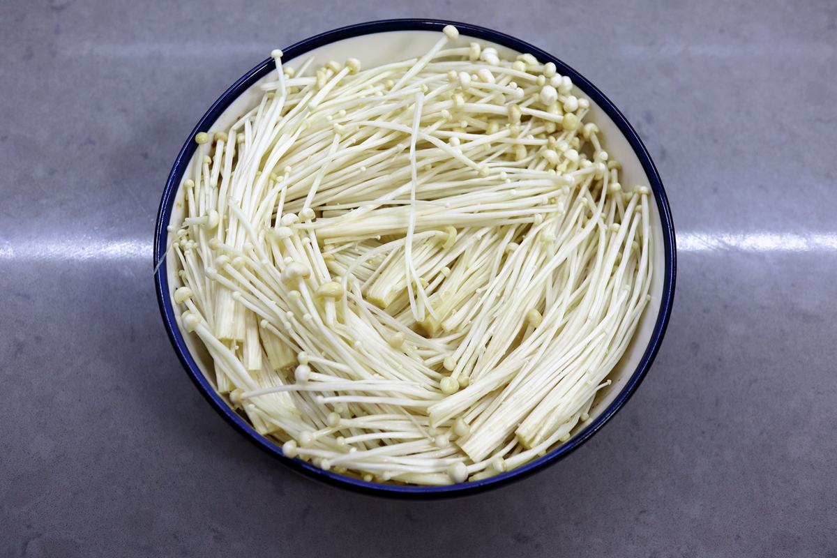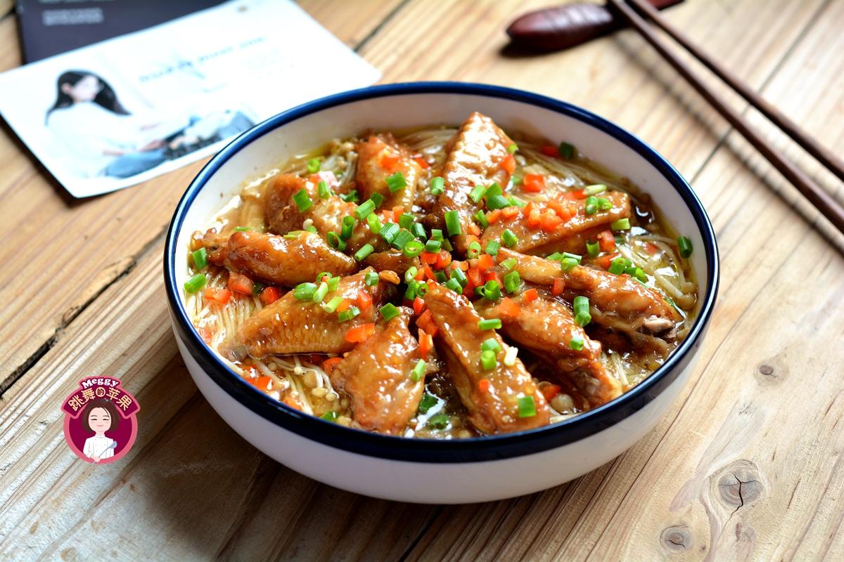 金针菇铺底,鸡翅腌制入味后码放在上面,入锅蒸一蒸。鸡翅滑嫩嫩的有滋味,而金针菇也因为自身的汁水和鸡翅汁混合在一起而变得鲜香脆嫩。撒一点儿绿香葱末和红辣椒丁,整盘看上去热闹非凡,诱人食欲。一定要趁热吃才能吃出金针菇的美妙噢!对了对了,不是常说要多吃一条腿的菜吗?这金针菇的独腿又长又脆又嫩,千万不要放过它!