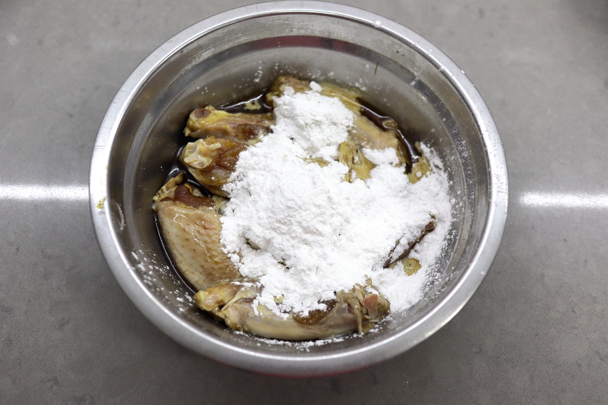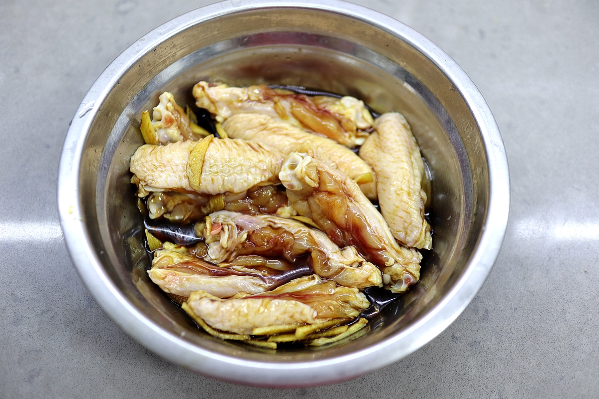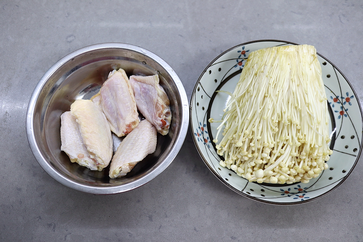 材料:鸡翅中5个,金针菇1把,生抽20克,蚝油20克,黄酒10克,盐2克,姜1块,淀粉30克左右,香葱少许,红辣椒少许