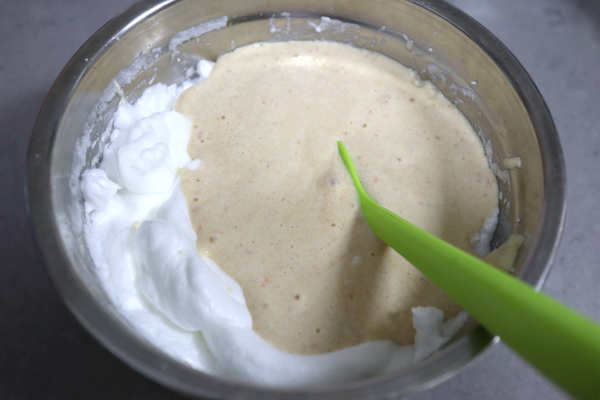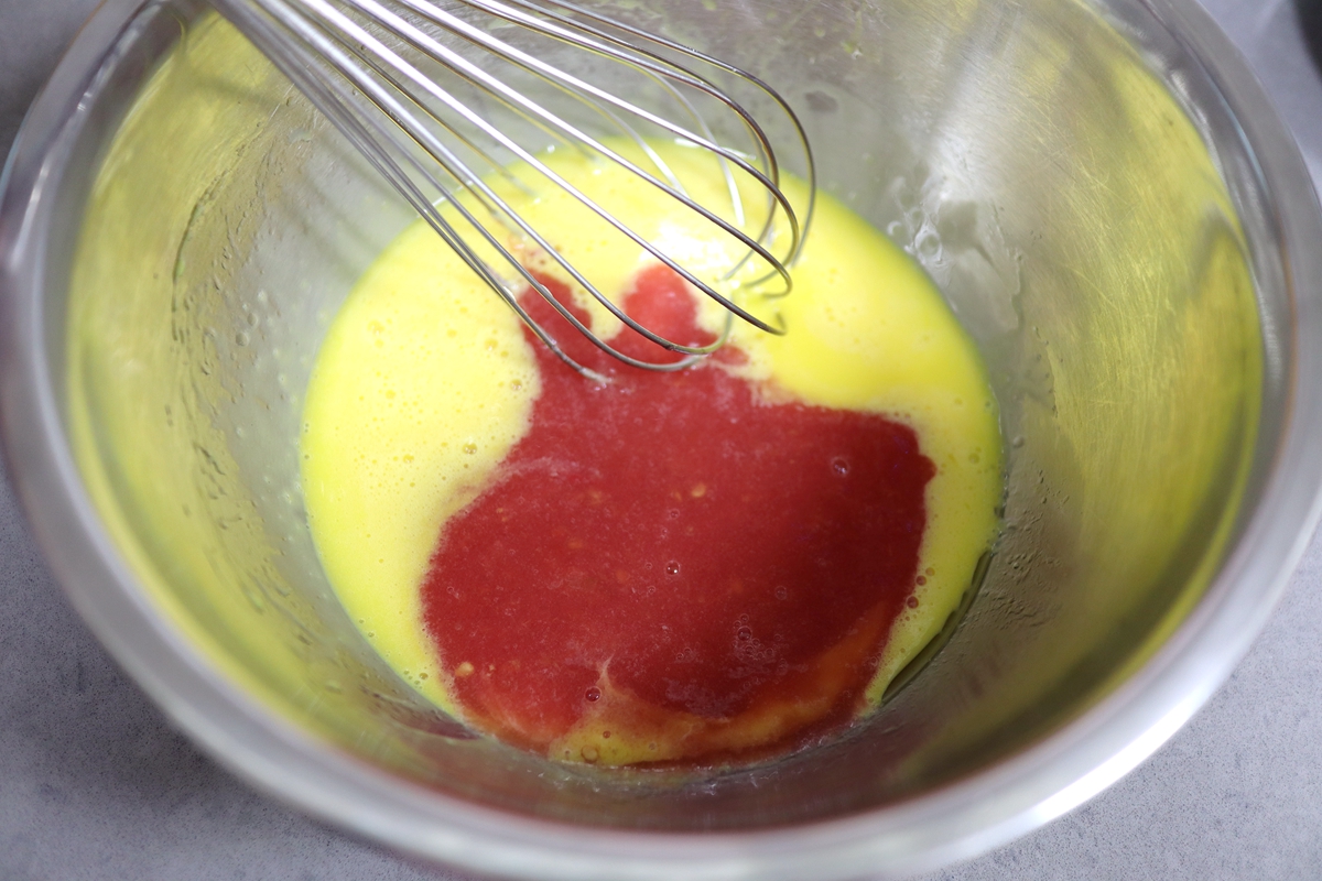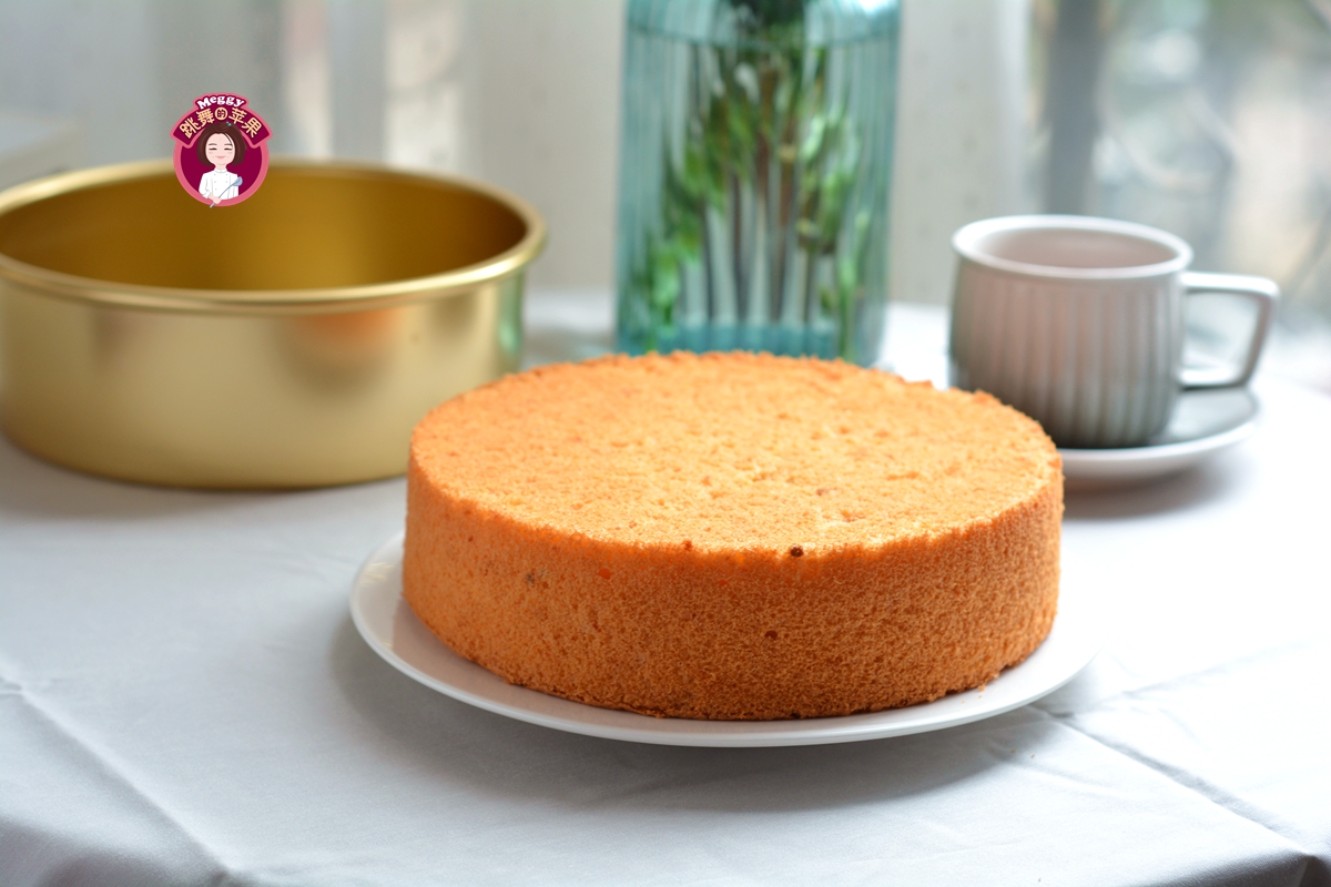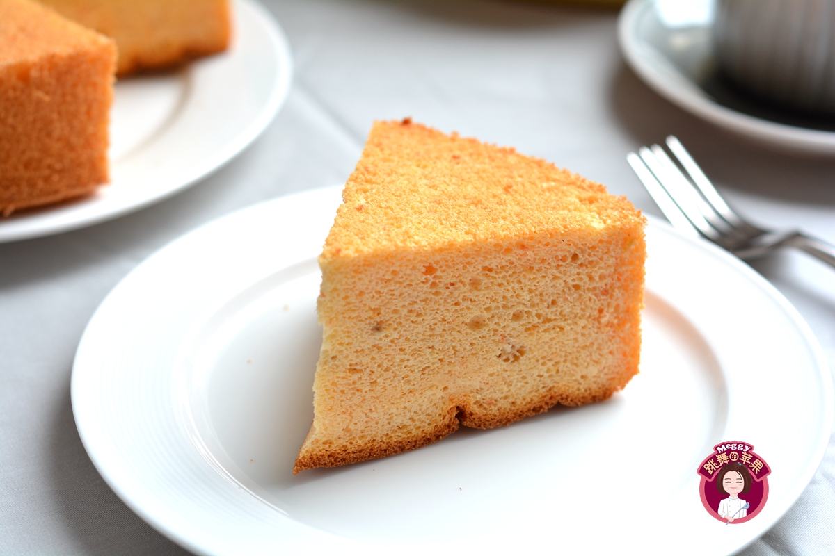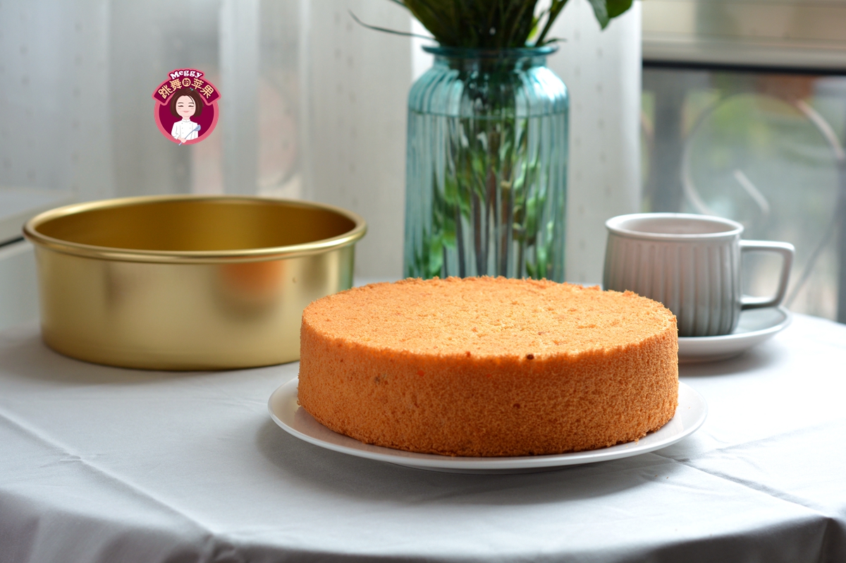 为什么会口感湿润?来比较一下两个配方就一目了然了。在鸡蛋保持大致不变的情况下,常用方中玉米油40克,牛奶60克,而在这个配方里,我将玉米油减为了30克,西红柿糊调整到了105克。尽管西红柿糊比牛奶略浓稠一些,但折算下来,总的液体量比标准配方的要多了30克左右,这也是戚风蛋糕口感湿润的一个原因。