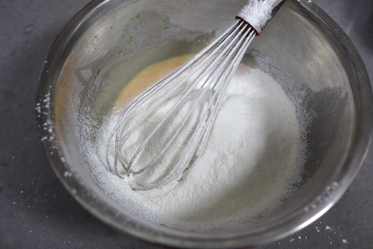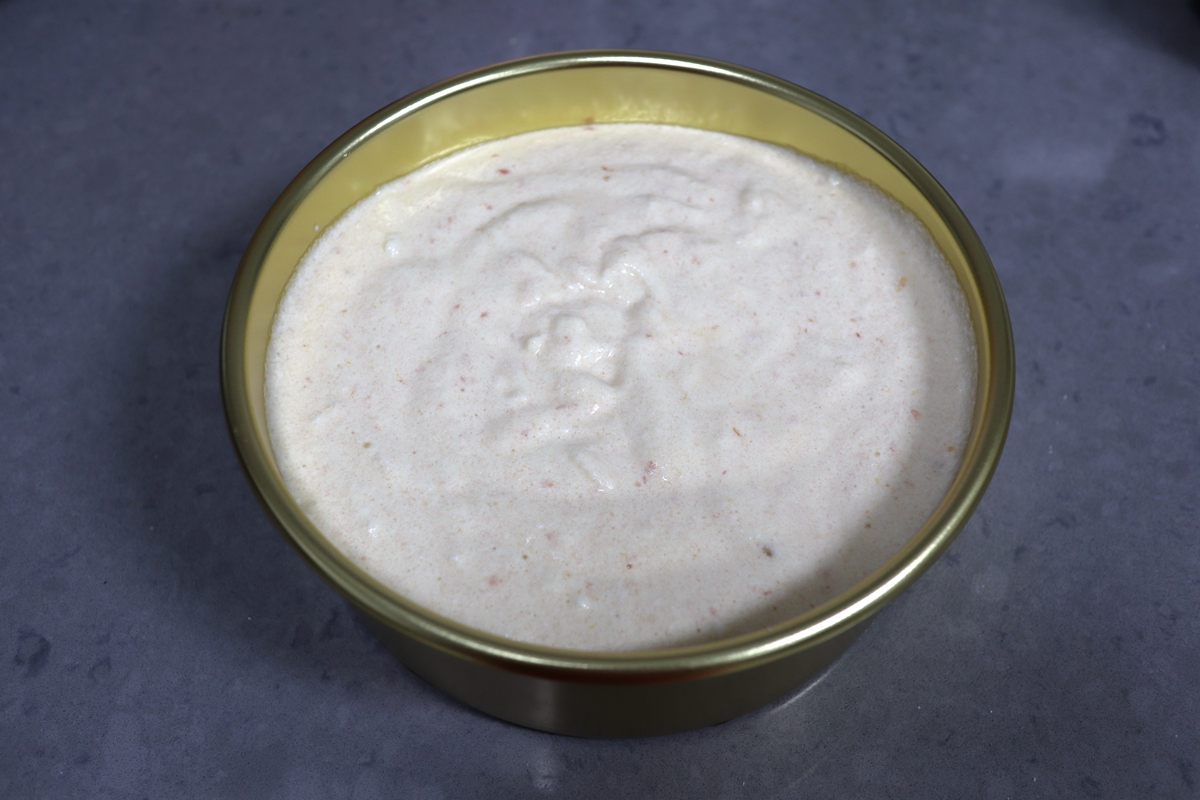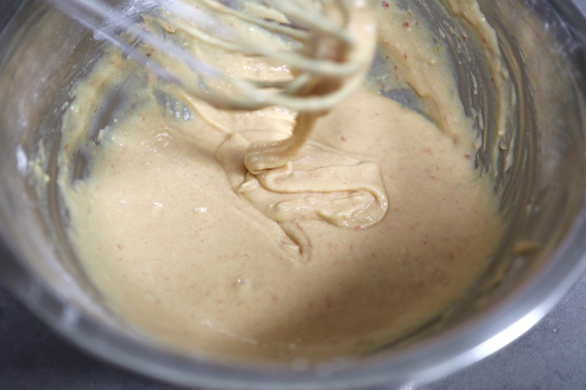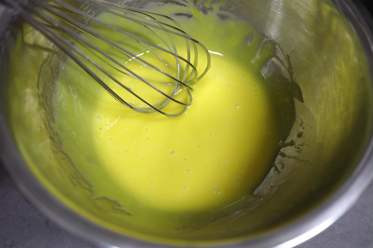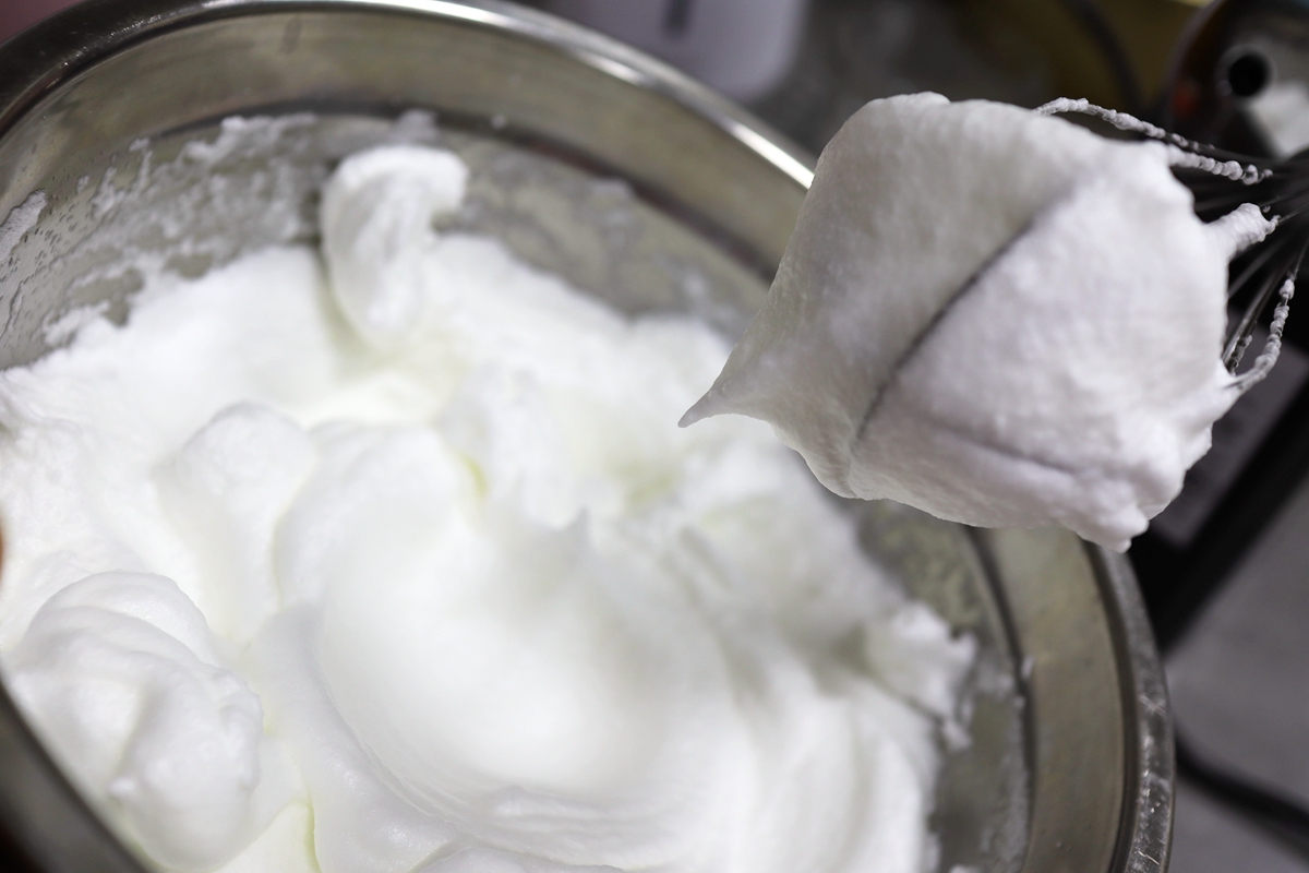 为什么会口感湿润?来比较一下两个配方就一目了然了。在鸡蛋保持大致不变的情况下,常用方中玉米油40克,牛奶60克,而在这个配方里,我将玉米油减为了30克,西红柿糊调整到了105克。尽管西红柿糊比牛奶略浓稠一些,但折算下来,总的液体量比标准配方的要多了30克左右,这也是戚风蛋糕口感湿润的一个原因。