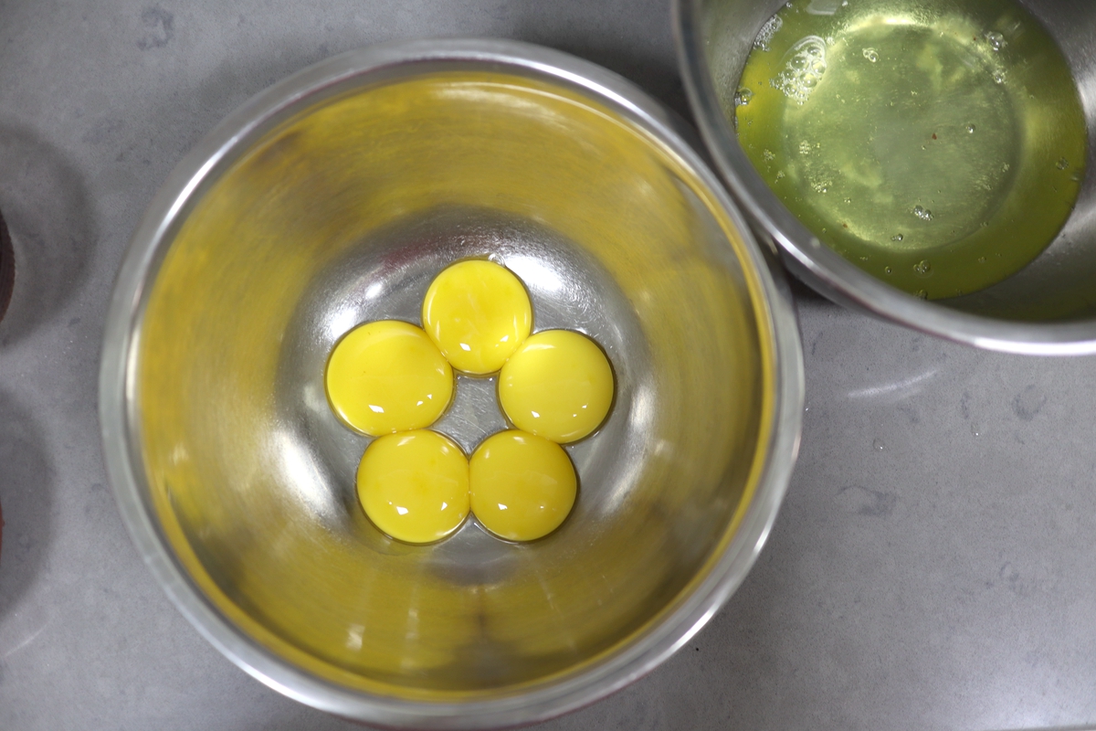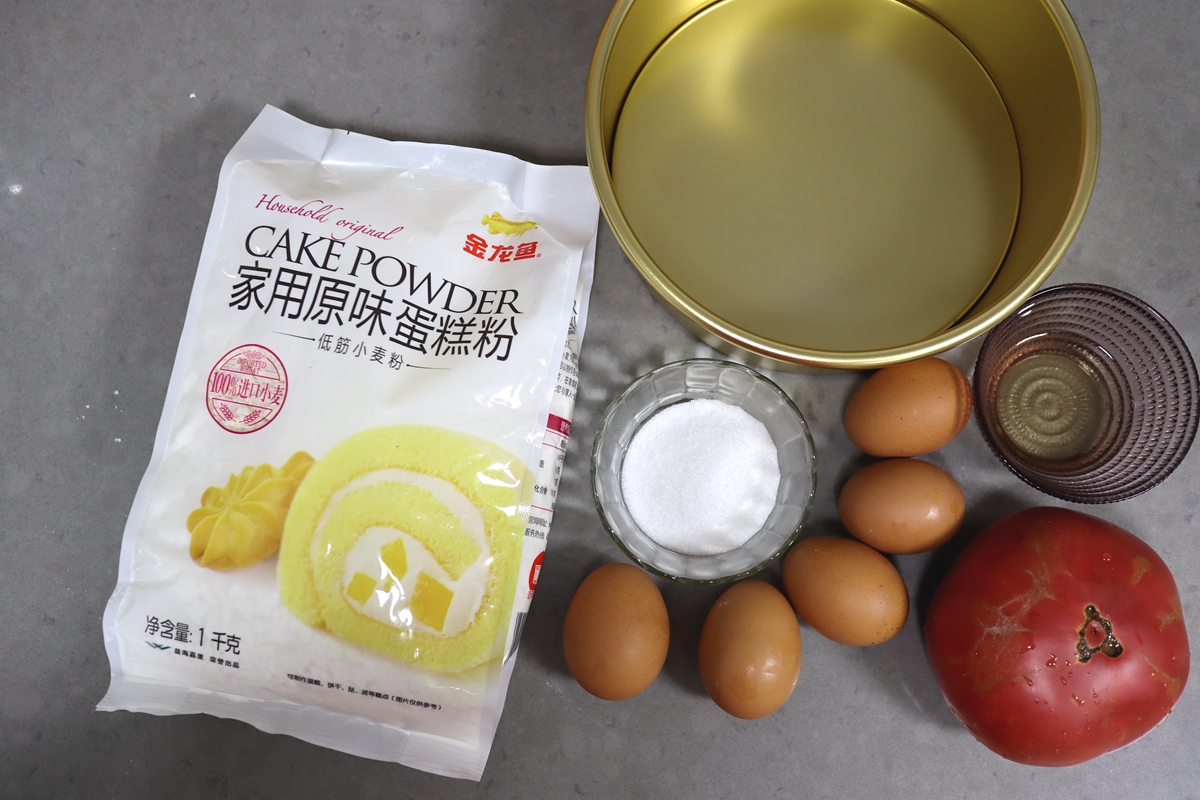 材料:金龙鱼低筋面粉90克,65克带壳鸡蛋5个,玉米油30克,蛋白用细砂糖35克,新鲜番茄糊105克