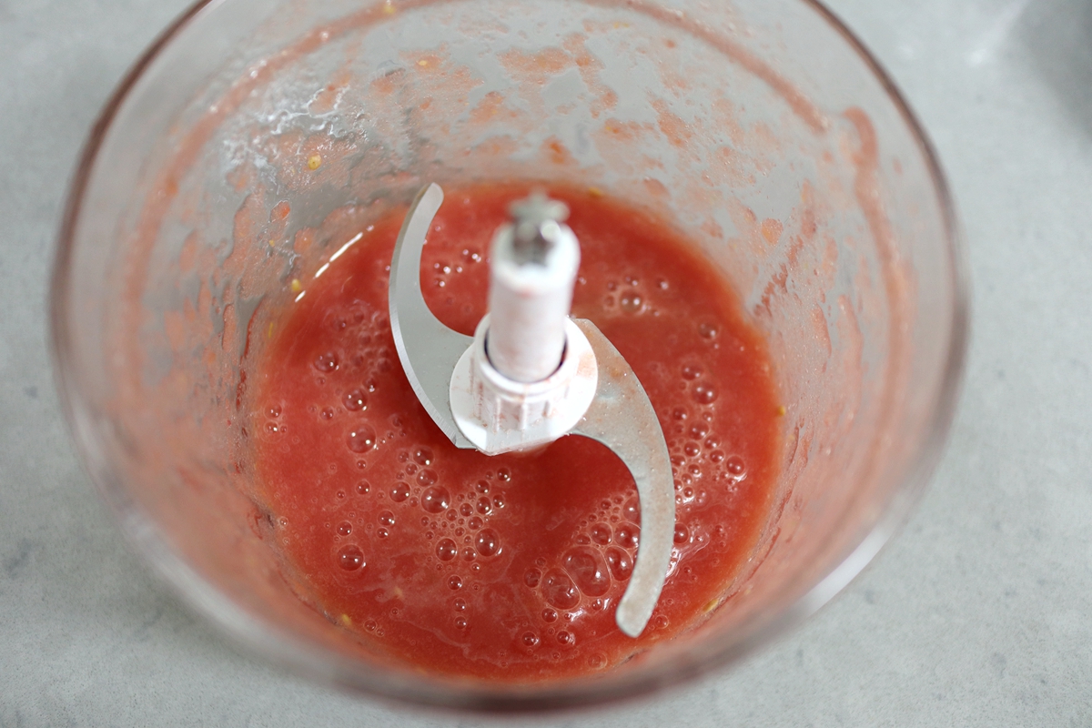 果然,西红柿打成糊糊后代替了牛奶,烤出的蛋糕与正常的配方没什么区别,只是在颜色上有那么一点点发粉;烤的时候会有很诱人的蛋香混合西红柿微酸的味道;吃的时候口感湿润很清爽。