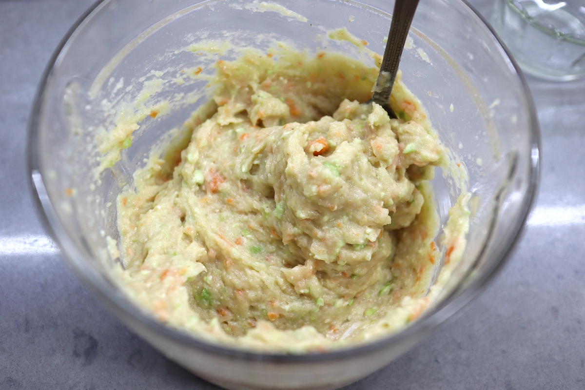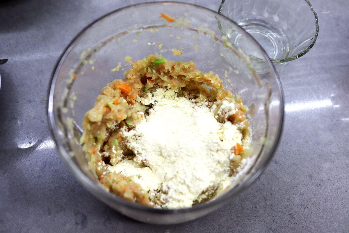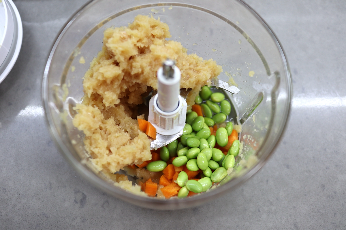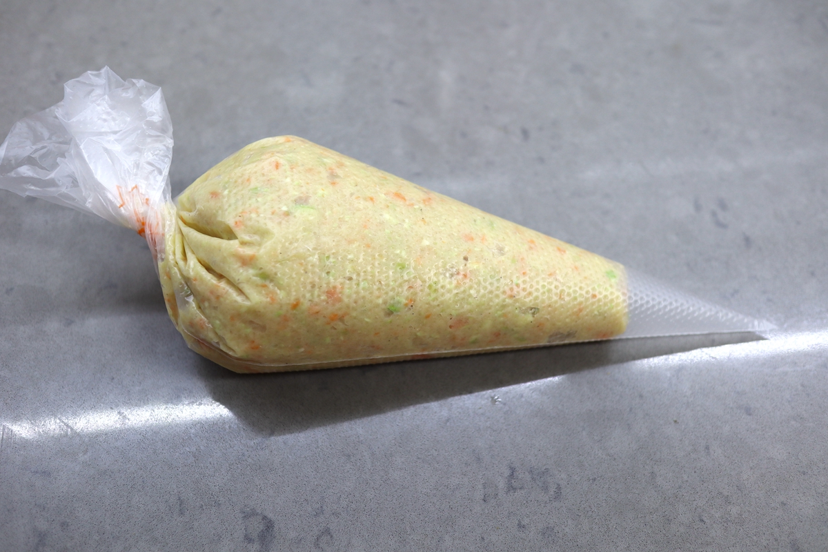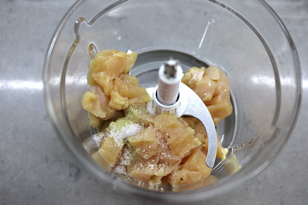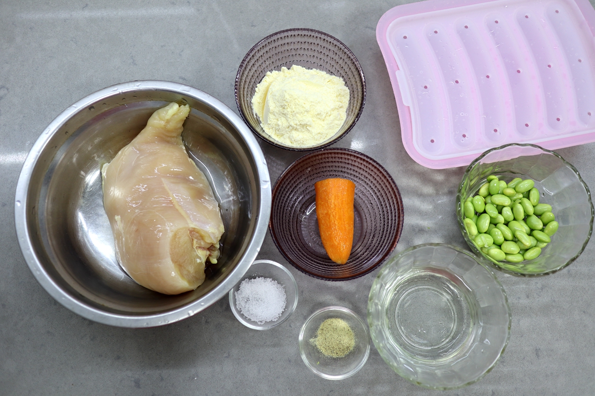 材料:鸡胸肉230克,玉米粉30克,胡萝卜30克,青豆30克,盐4克,白胡椒粉4克,凉水适量(约110克)