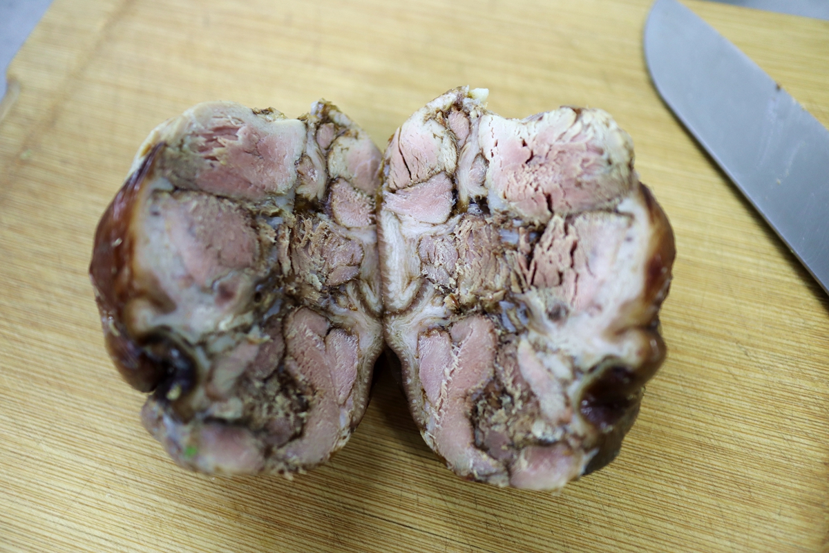 我的做法非常简单,肘子剔骨,煮开撇沫,倒入全部的调料,用电饭煲的“煲汤”程序。每个品牌的电饭煲的煲汤程序不一样,用过一次之后可以攒点经验,看看时间上是不是能炖到自己想要的口感来调整下次的用时。炖好的肘子在汤里泡到凉,吸足味儿,再入冰箱冷藏变硬,切出来的肉片整齐又好看,直接吃或者蘸蒜醋汁,过瘾了!