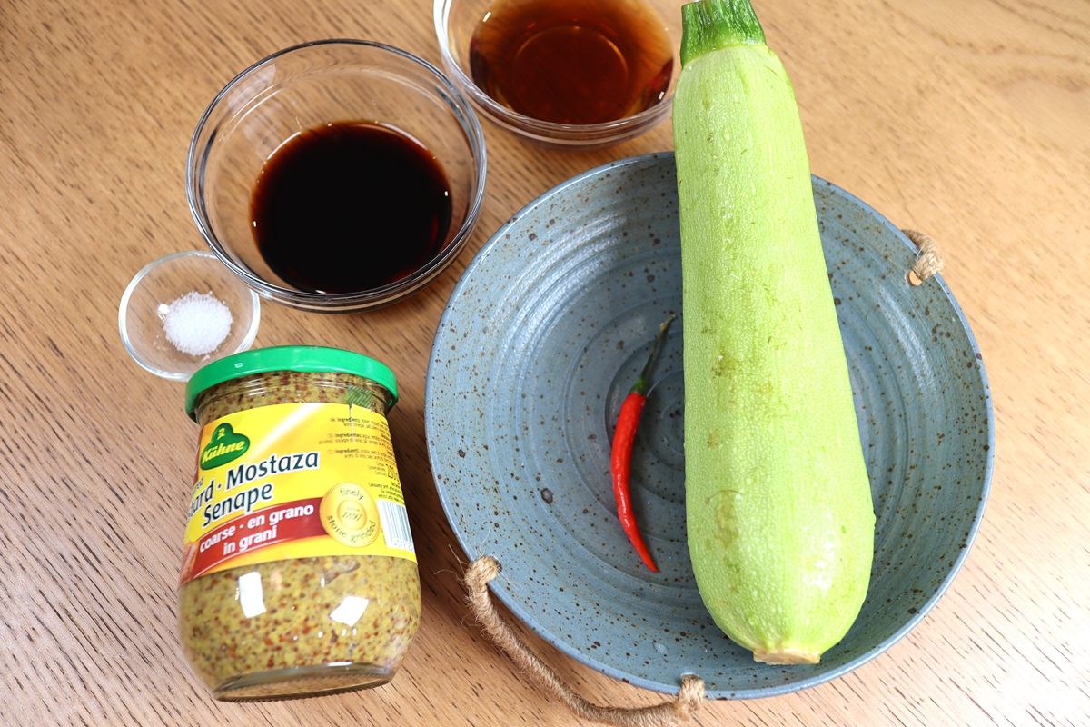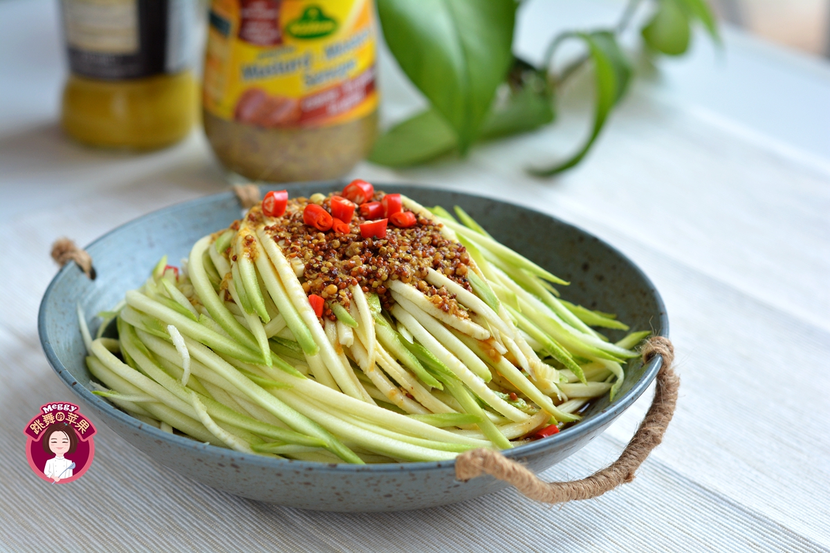 材料:西葫芦1根,小米辣1个,生抽40克,米醋40克,盐1克,冠利粗粒芥末酱一大勺
