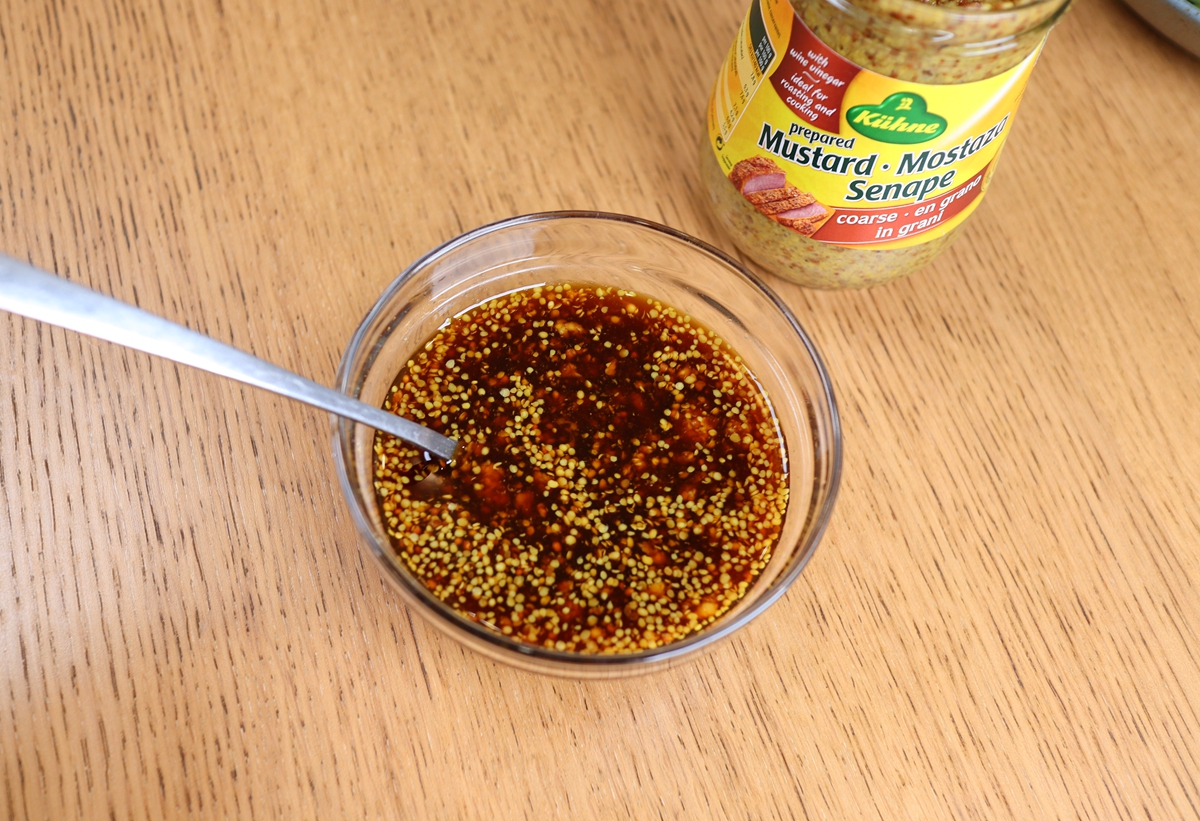 北京人喜欢在凉拌菜中放点芥末,有通气作用。著名的“芥末墩儿”就是用白菜浇上芥末酱制作而成的,一般人吃不了,因为太辣,辣到吃一口就抑制不住地猛流眼泪,但治疗伤风感冒效果极佳。话说回来了,咱吃饭是为了享受,不是为了受罪,吃顿饭还“泪流满面”,听着有点那个呵。所以我用了一款粗粒芥末酱,既有芥末的微辣,增加风味,还能享受到芥末籽在口中跳跃的活泼感。