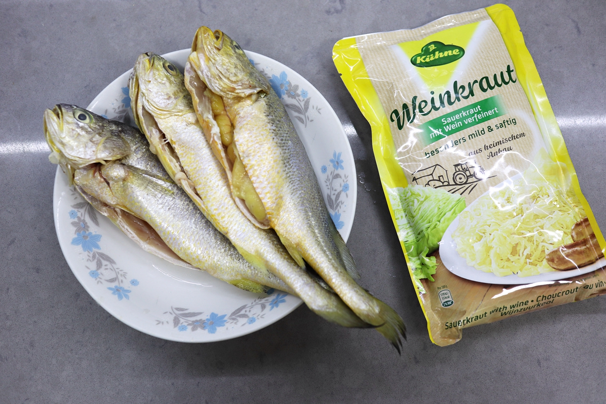 材料:小黄花鱼3条,冠利酸圆白菜1袋,植物油适量,中筋面粉20克,盐2克,小米辣1个,香葱1棵,大葱1段,姜1块,大蒜4瓣