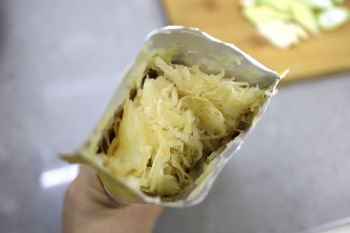 酸菜我既没用南方特有的那种酸菜,也没用东北的酸菜,而是用了西餐中经常使用的酸圆白菜。酸圆白菜口感细嫩,口感不是特别脆,但是入口醇厚。它出镜率最高的时候是和西餐中的烤肉在一起,特别是德国的烤猪肘子,一定要配上这个酸白菜才解腻,也更能突出烤肘子的肥嫩。