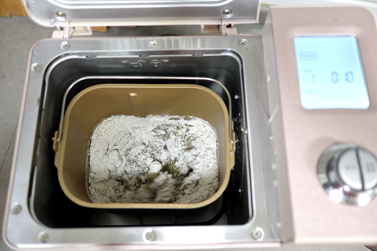 2. 将除了黄油的全部材料入面包桶中,再安放进面包机中;我用的东菱JD08面包机,用了一个揉面程序10分钟;
