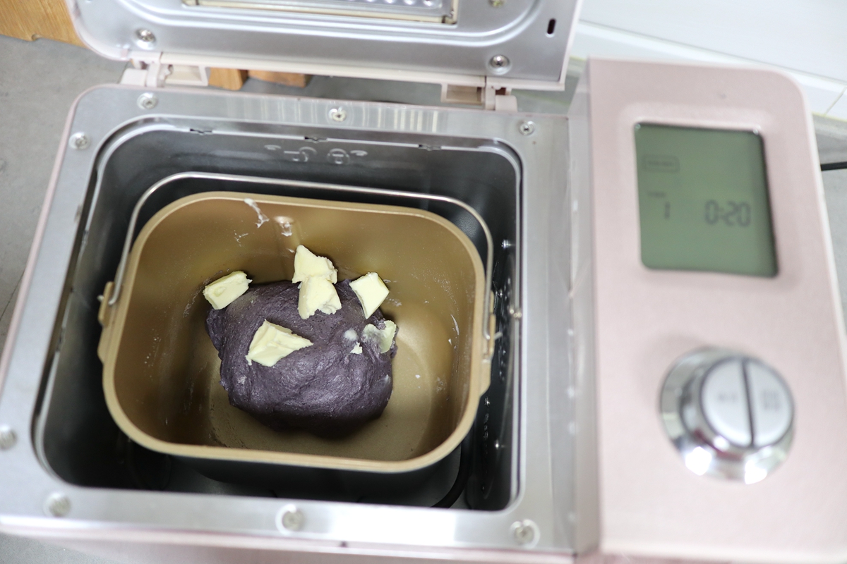 3. 10分钟后,面团成型且滋润,能拉出粗膜,将黄油倒入面团中,再启动一个揉面程序20分钟;