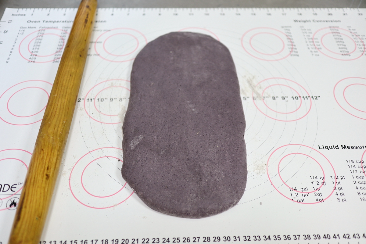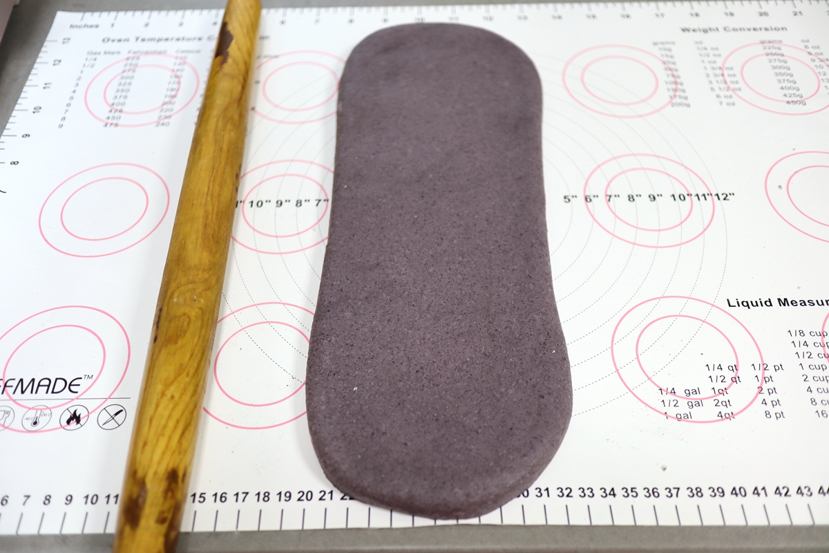 5. 面团放在面包桶中,松弛10分钟后取出,放在揉面垫上,擀成厚约1公分的长方形面片;