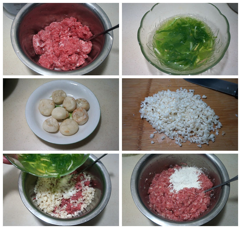 5. 荸荠入肉馅中,根据口味加盐;再将葱姜水分几次倒入肉馅中;