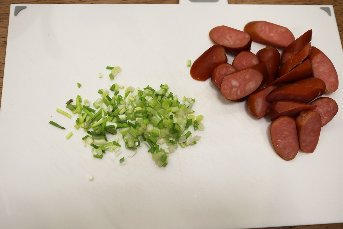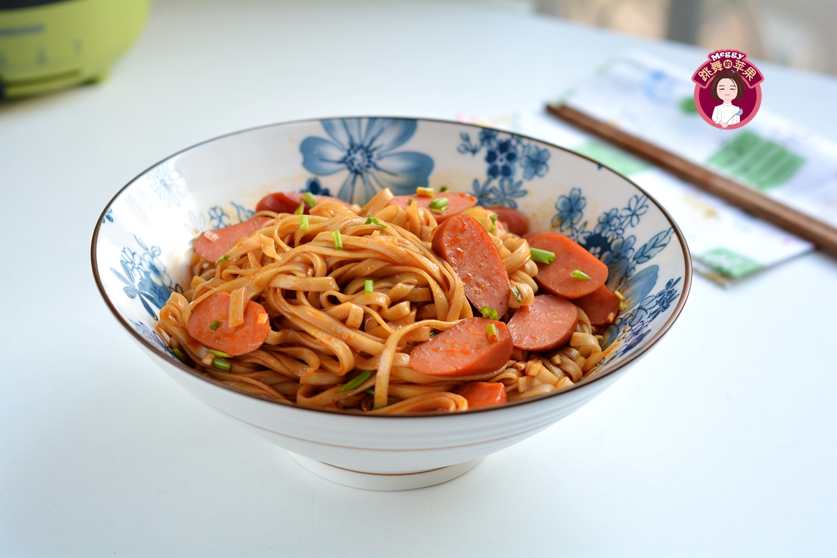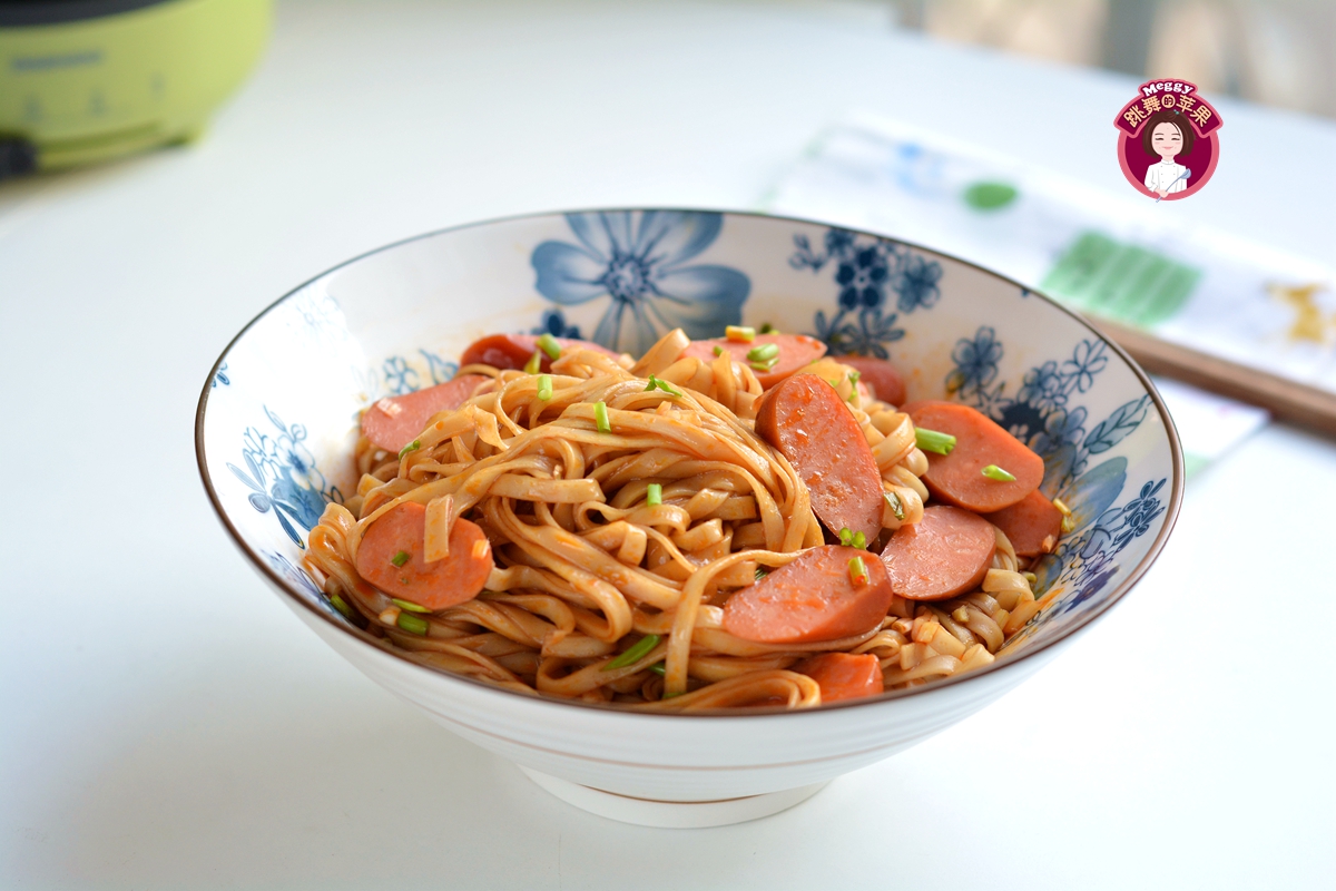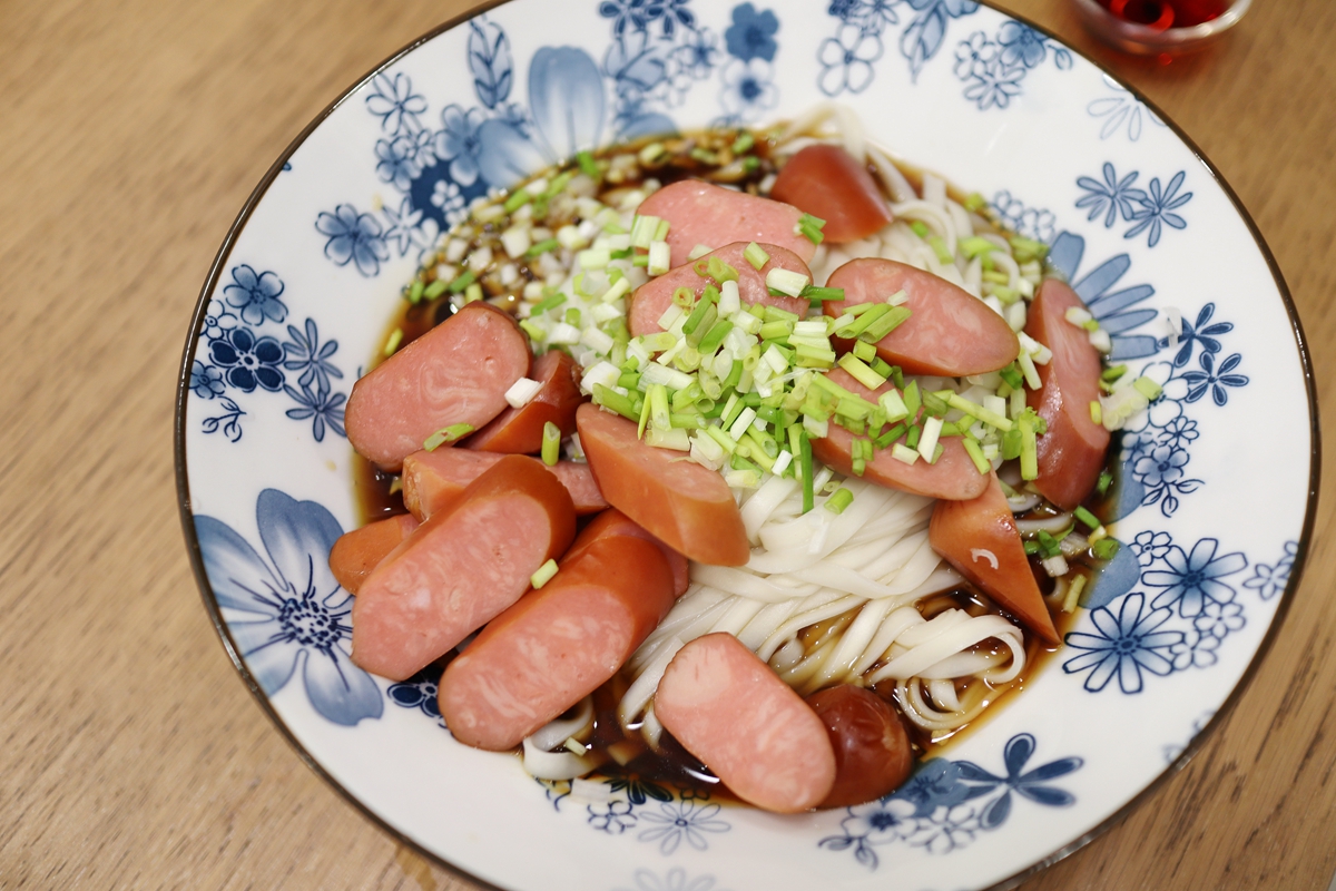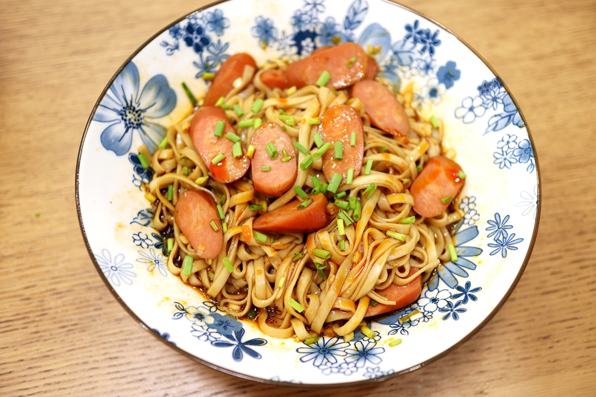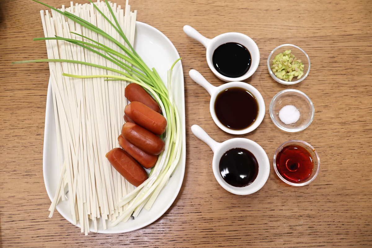 材料:挂面1把,火腿肠1袋,香葱1把,香醋20克,酱油25克,蚝油10克,盐1克,姜末少许、辣椒油适量,