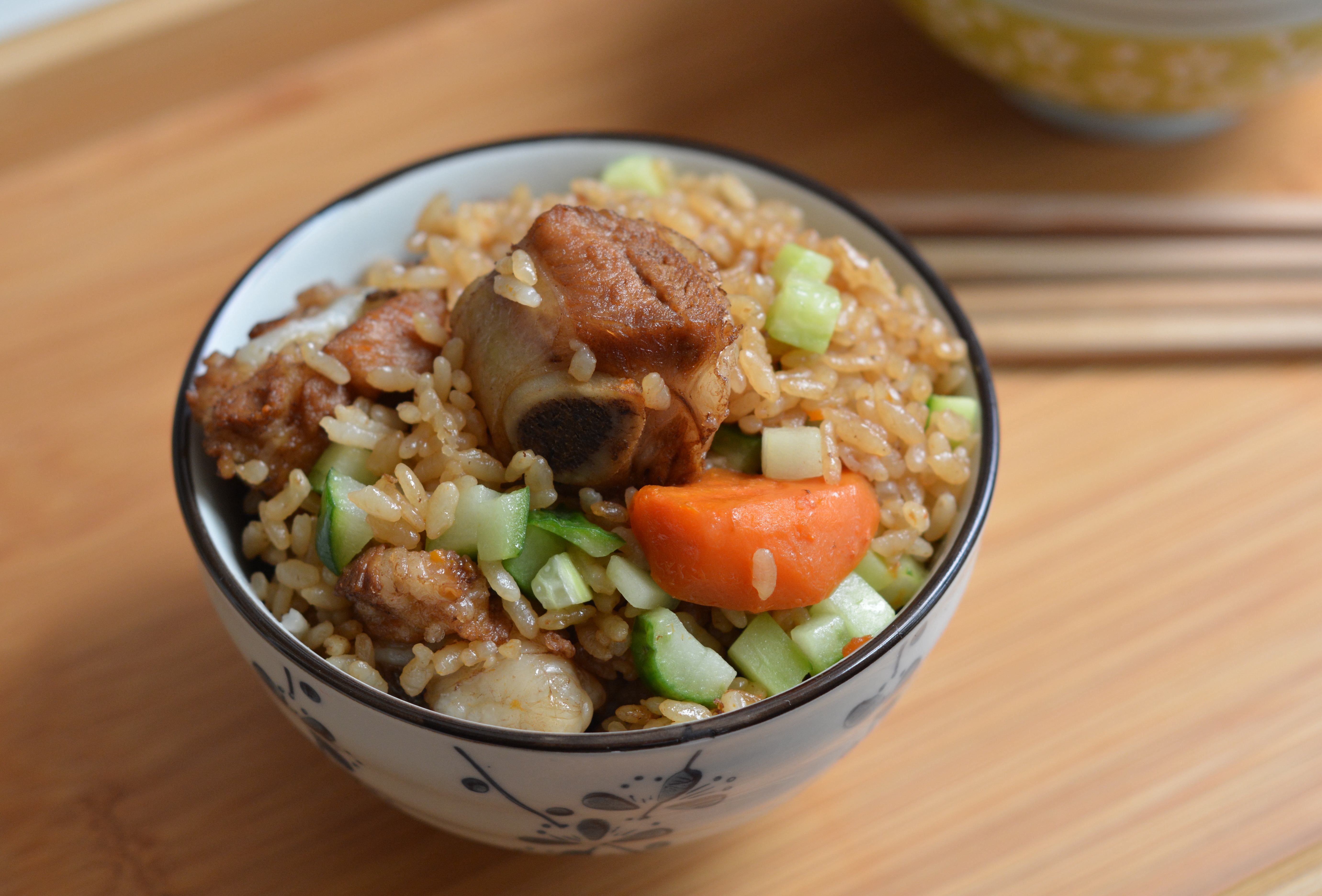 材料:大米2杯,清水适量,肋排360克,胡萝卜1根,黄瓜1条,植物油少许,大蒜6瓣,酱油适量,盐适量