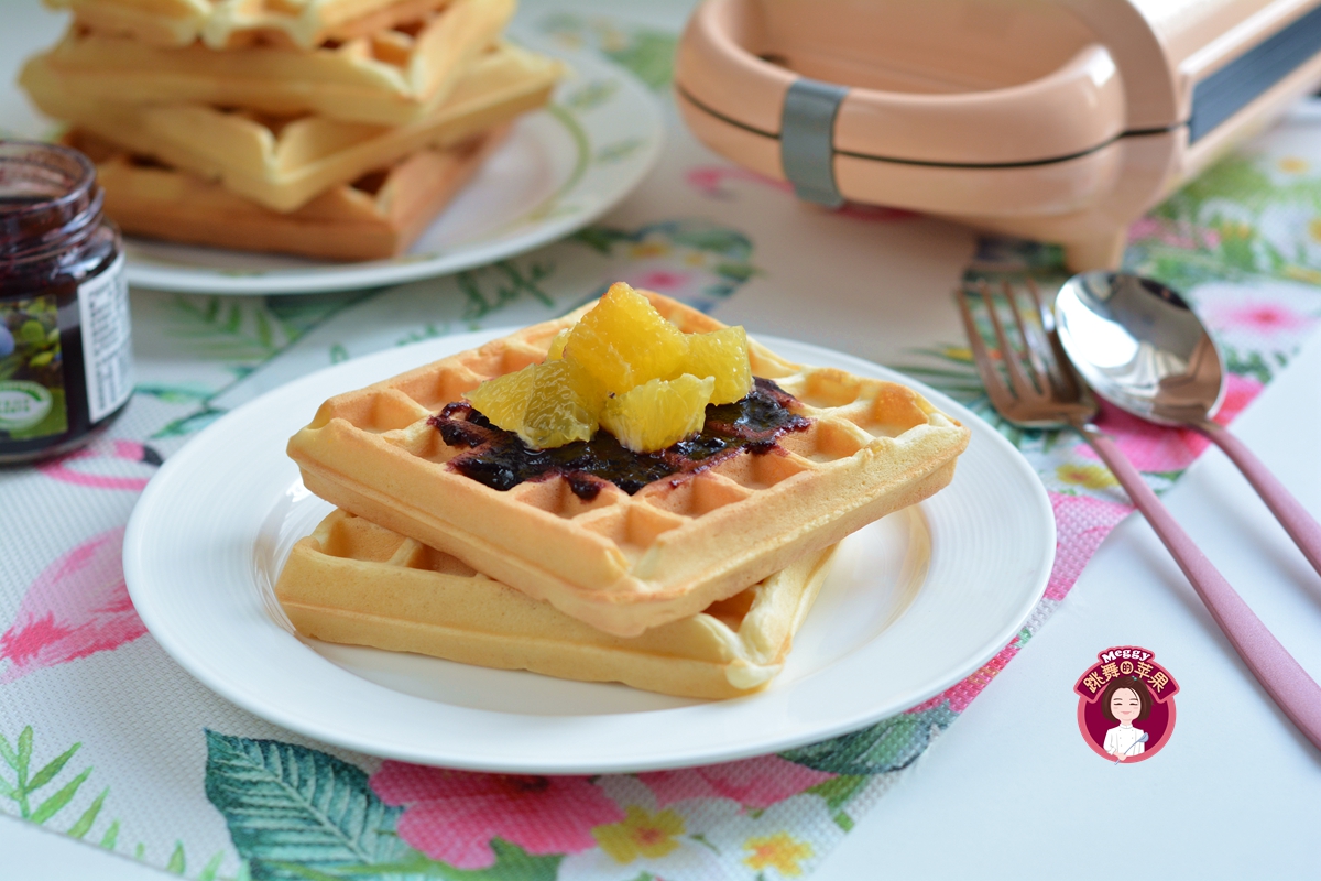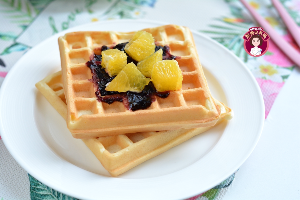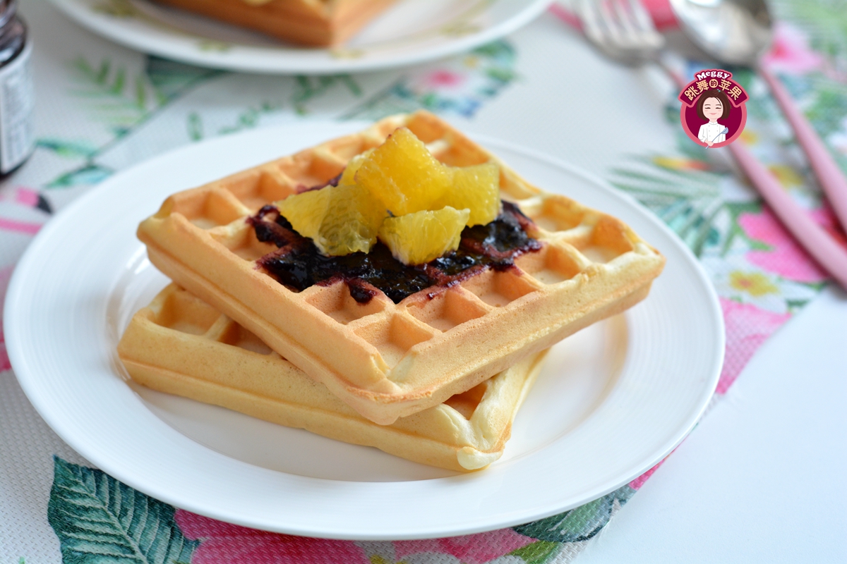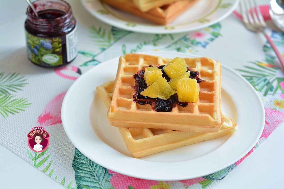 今天我做的蛋糕版华夫饼,在低筋面粉中加入少量玉米淀粉,做出来的华夫饼口感更加酥松,没有玉米淀粉可以用等量的低筋面粉来代替,口感也差别不太大。喷香的华夫饼满屋飘香,我这么有节制的人都hold不住了,烤出来一张先尝了尝,一发不可收拾!又酥又香不太甜,白嘴儿吃了一张,又抹了蓝莓果酱吃了一张。前后8张,我先“报销”了两张。