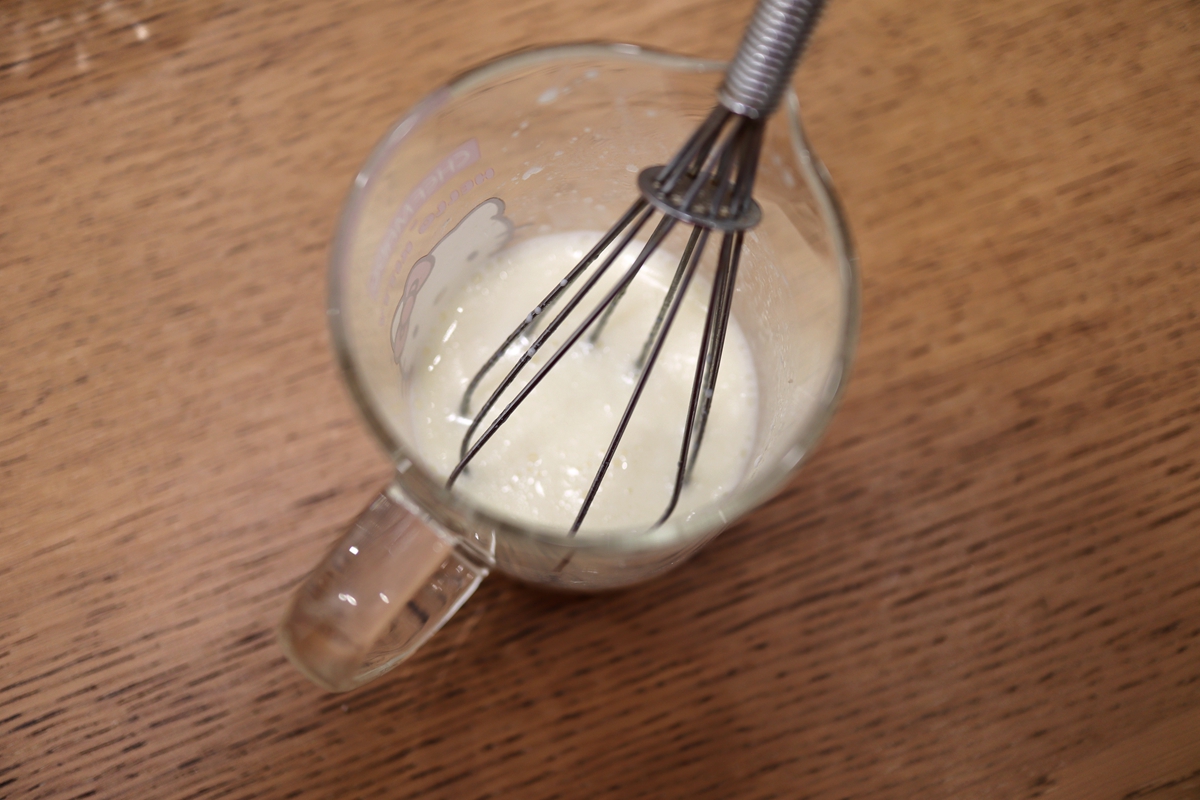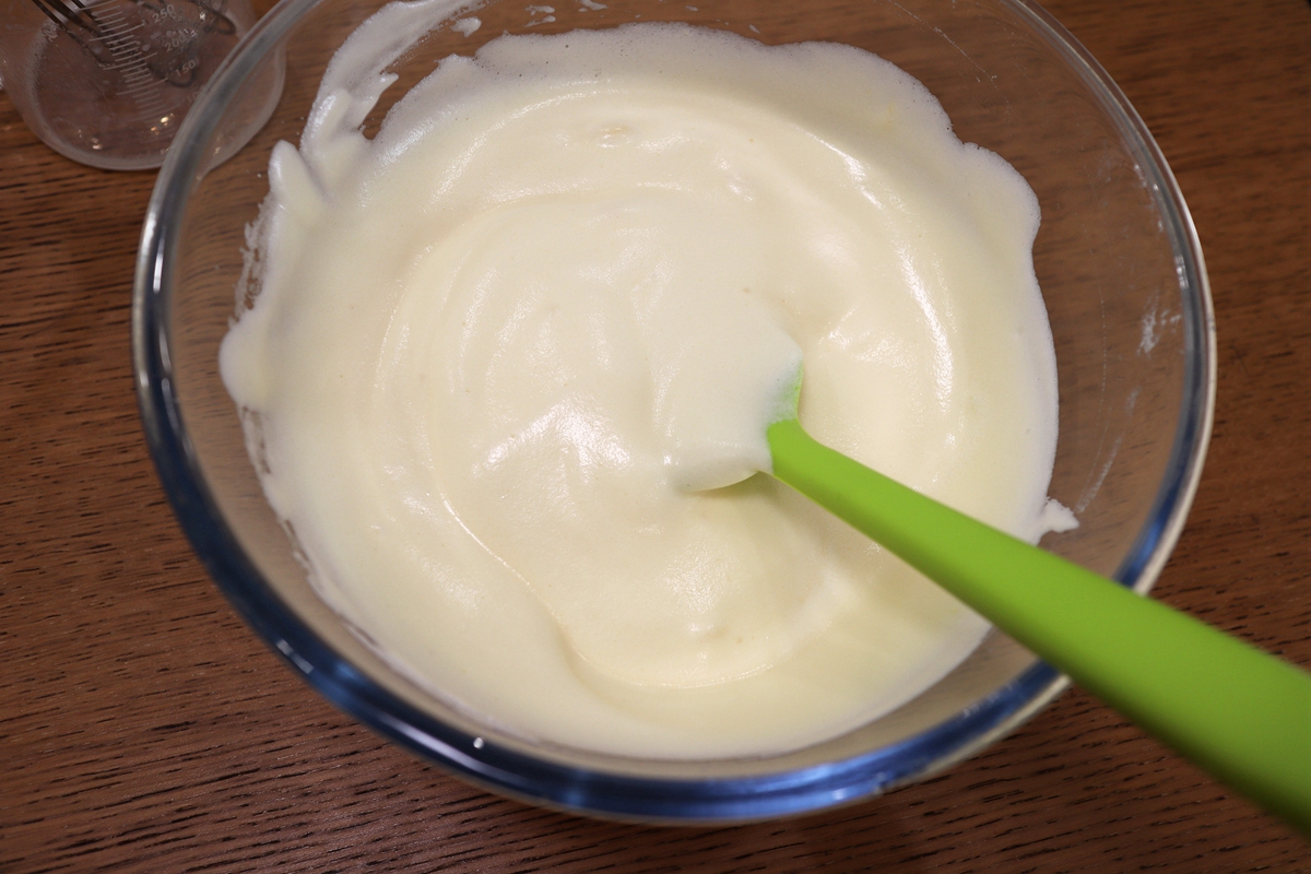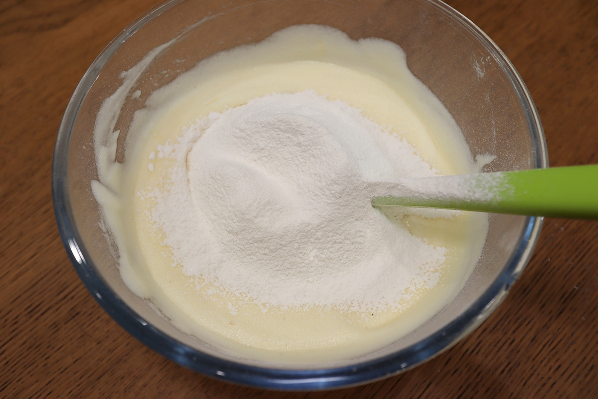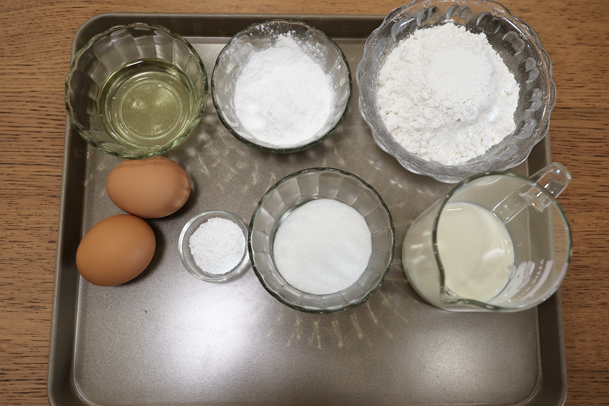材料:鸡蛋2个,白糖40克,牛奶60克,玉米油30克,低筋面粉100克,玉米淀粉25克,泡打粉6克
