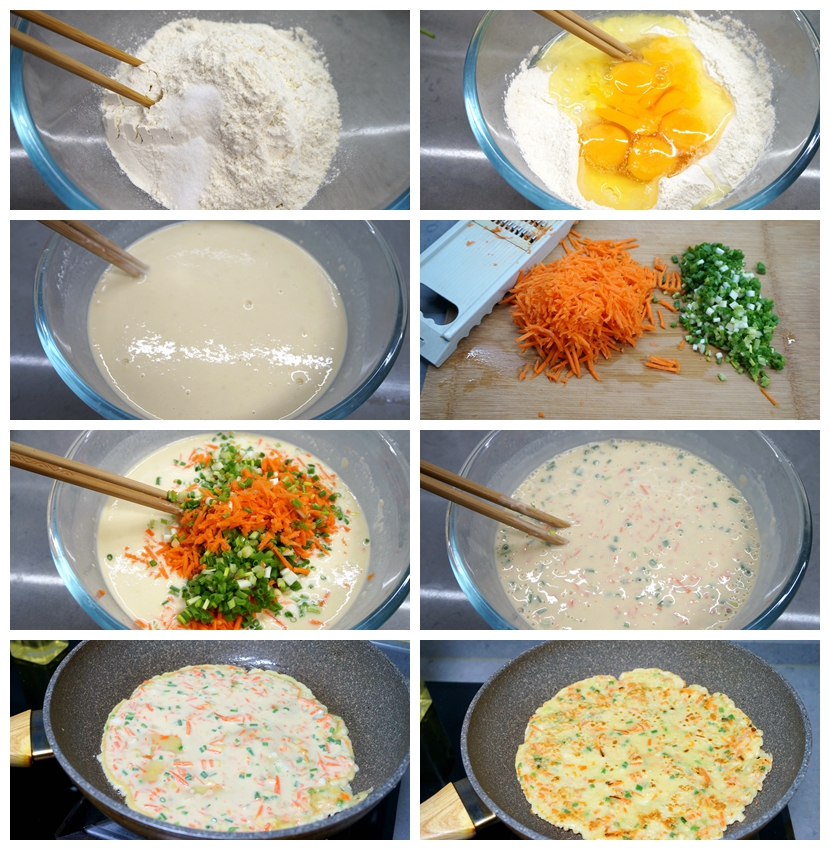 2. 香葱胡萝卜可以随四季进行调整,如西葫芦、芹菜叶、小虾皮等;如果不放盐,可以在软饼做好后抹酱,或者夹香肠等物,味道和营养更丰富。