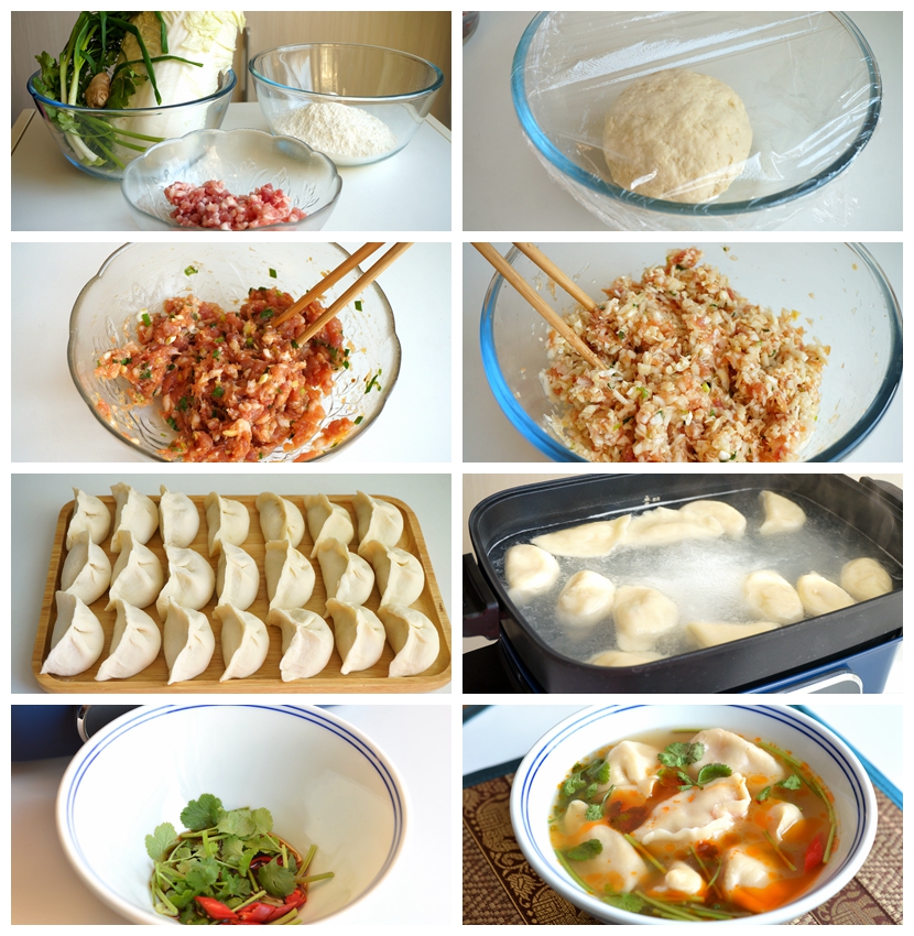 6. 入开水锅中,中途在水沸腾时点少许凉水三次,待饺子肚子鼓鼓的,就可出锅了;