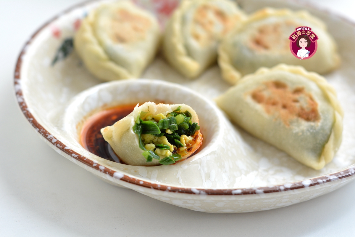 8. 因为饺子比较饱满,可以翻身煎,再淋一点点水,盖盖子焖2分钟;馅是鸡蛋韭菜素馅的,只要将饺子3面煎熟煎焦黄就可以出锅了。