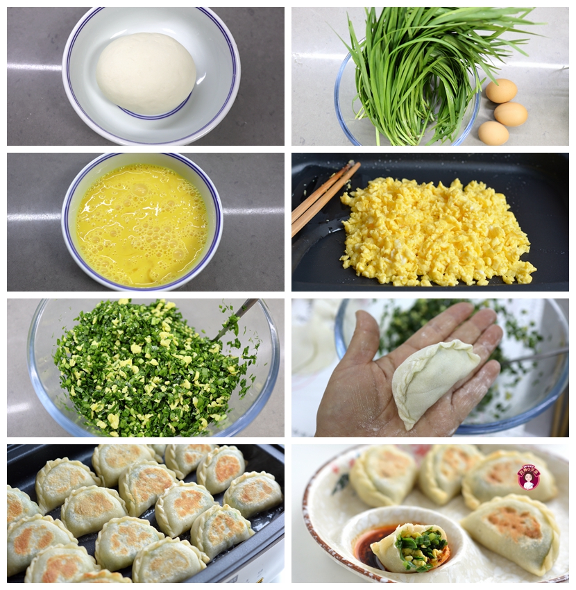 头天晚上的准备:揉一块面,这个过程正好可以饧面;韭菜洗净,沥干水;炒鸡蛋,晾凉的过程中切韭菜;拌馅;面团搓揉成条,切剂子,擀皮;包饺子,随包随码放进锅中。