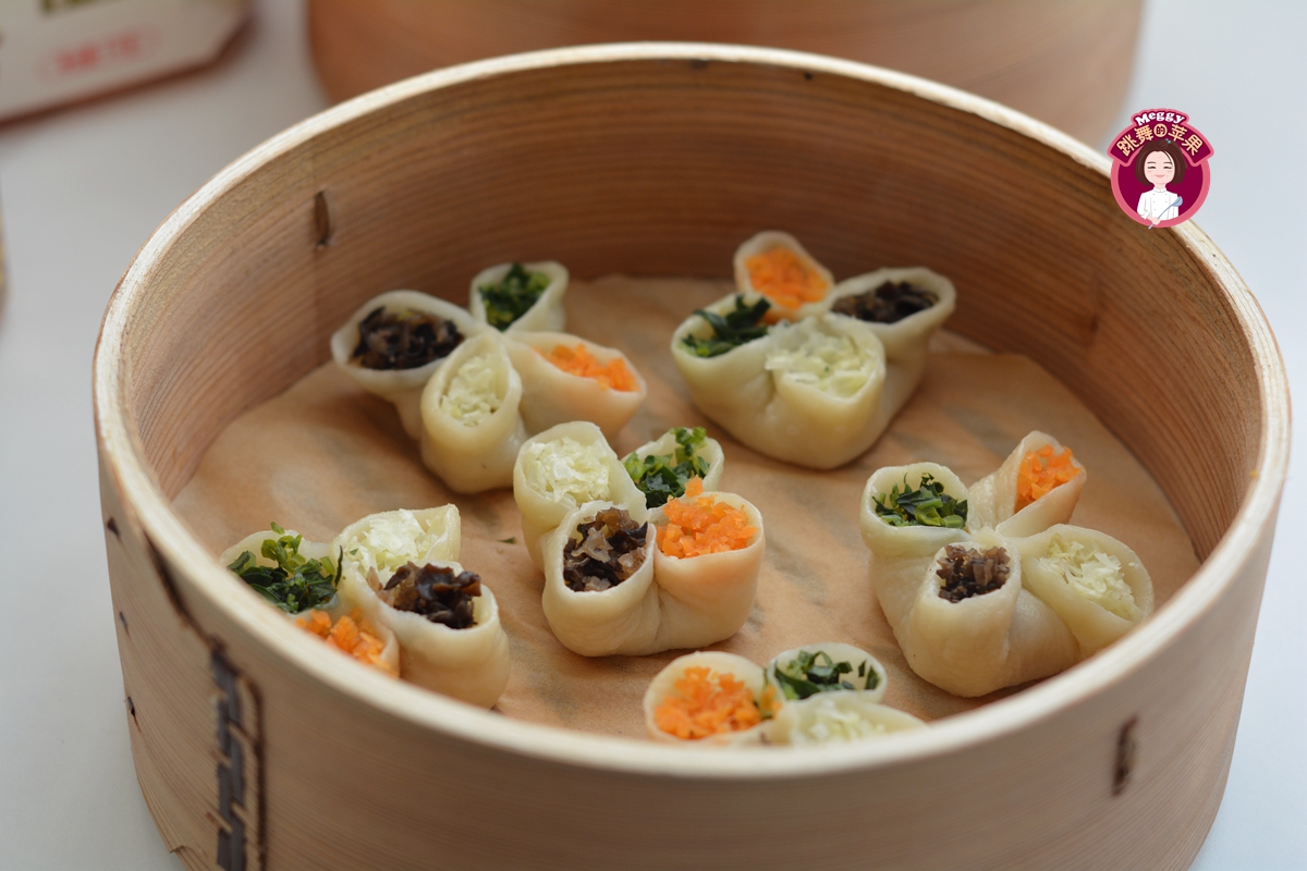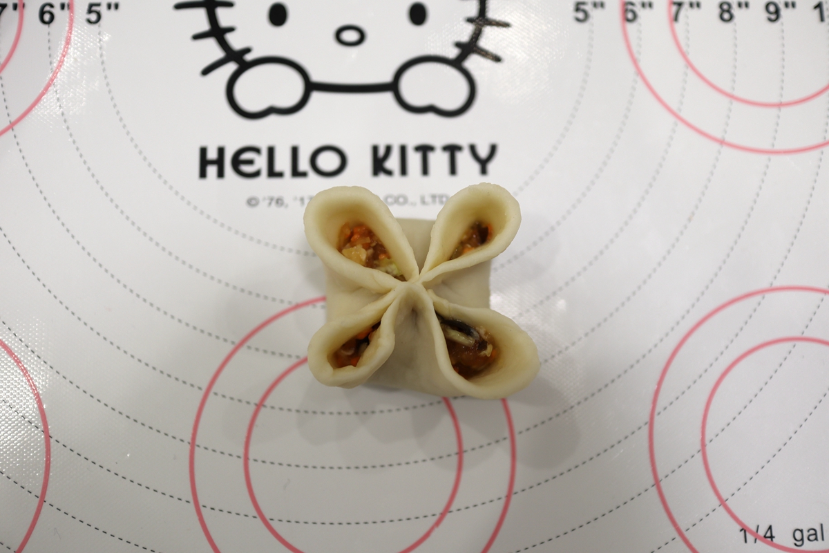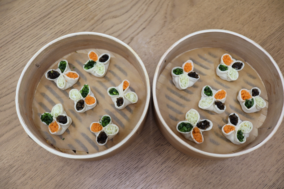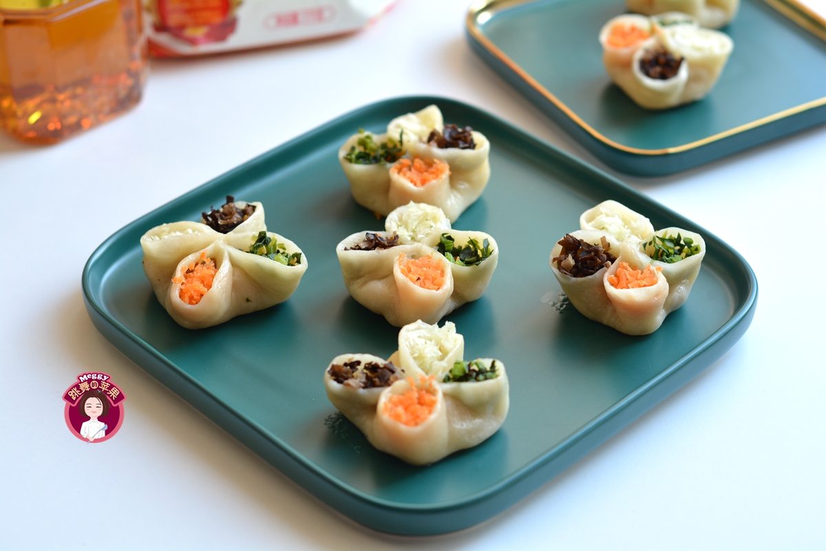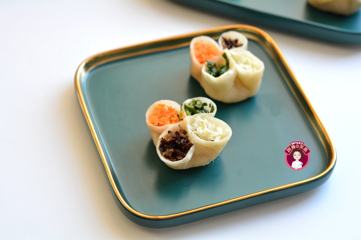 11. 相邻的两个花瓣芯捏合在一起,使花瓣更大更饱满;在每个花瓣处分别填上四种蔬菜,每包好一个就放在蒸锅内;