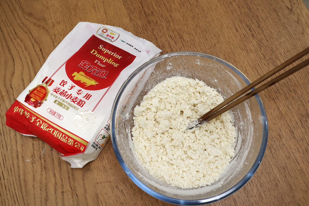 1. 金龙鱼饺子专用麦芯小麦粉倒入大碗中,沸水晾3分钟约在90度的时候倒入面粉中,拿不准时逐量倒,用筷子搅拌成絮状,无干粉;晾一晾,让热气散去大部分;