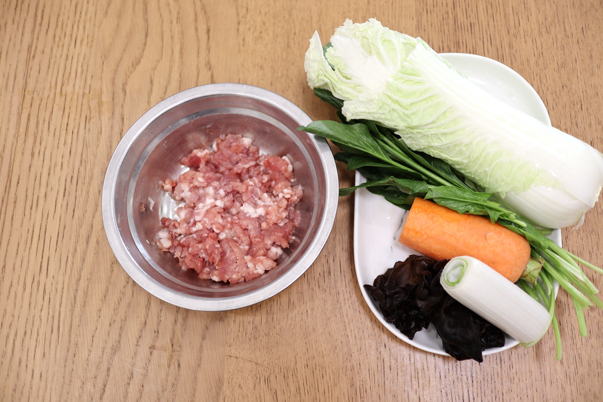 3. 猪肉馅200克,大白菜、菠菜、胡萝卜、泡发的黑木耳、大葱清洗干净;