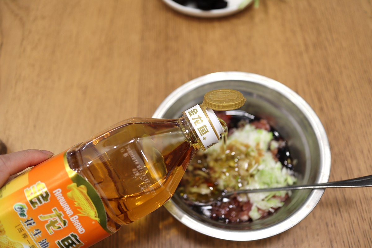 2. 肉馅用量比较少,而且肉偏瘦,所以需要放一些油增加馅料的香润,放芝麻香油会压了胡萝卜的香甜味,所以我放的金龙鱼花生油,因为是大品牌,选用的花生原料都是优质的,油质清澈,比普通的花生油更香,还不会压了白菜和胡萝卜的清甜味道,而口感却香润有加。