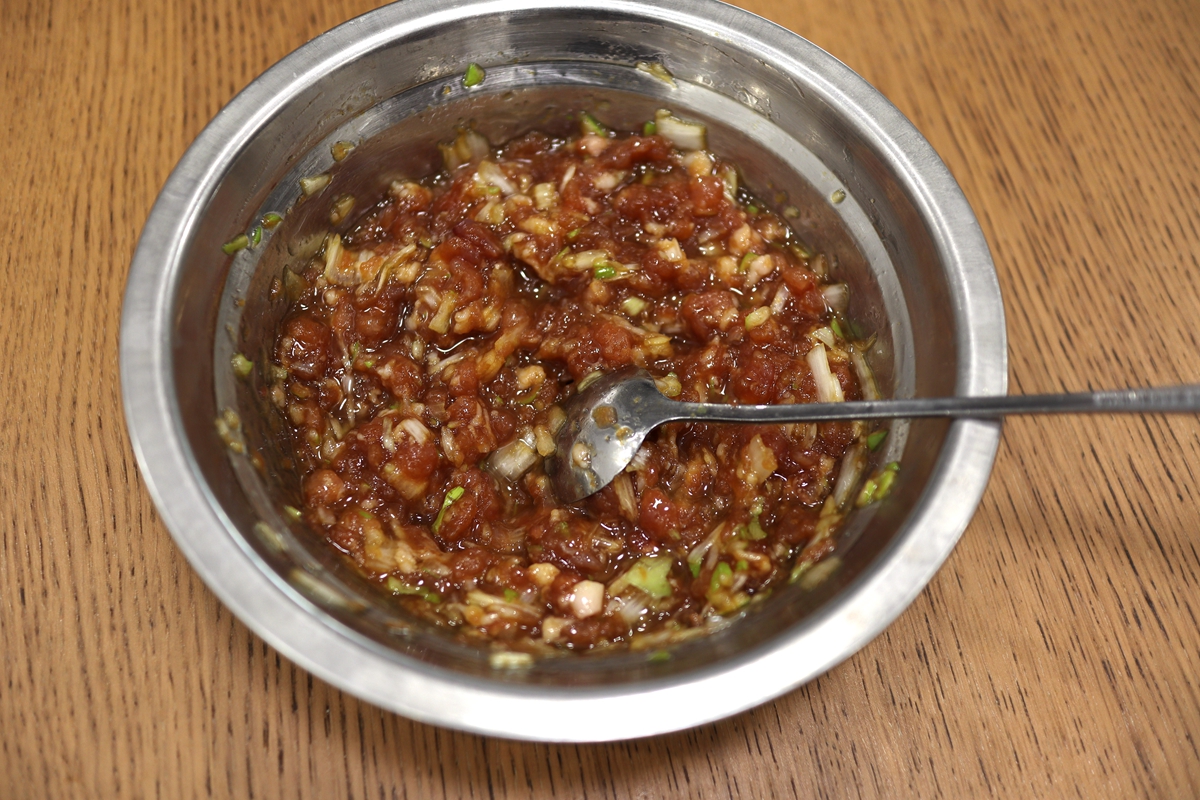 5. 用小勺将调料完全混合进肉馅中,不要加水噢;