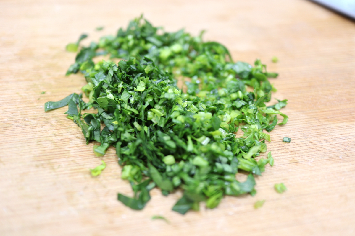 7. 菠菜用刀切成碎末即可,只做装饰用,不用放馅里;