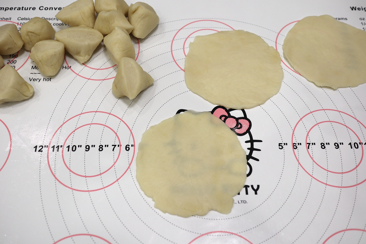 8. 饧好的烫面团弹性没有凉水面团强,所以擀皮时要轻柔,防止擀破;