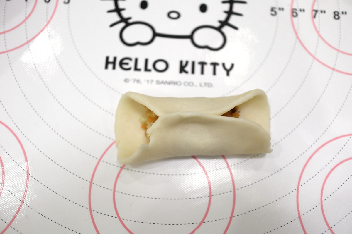 9. 取适量馅料放在皮子中间,上下皮对捏;