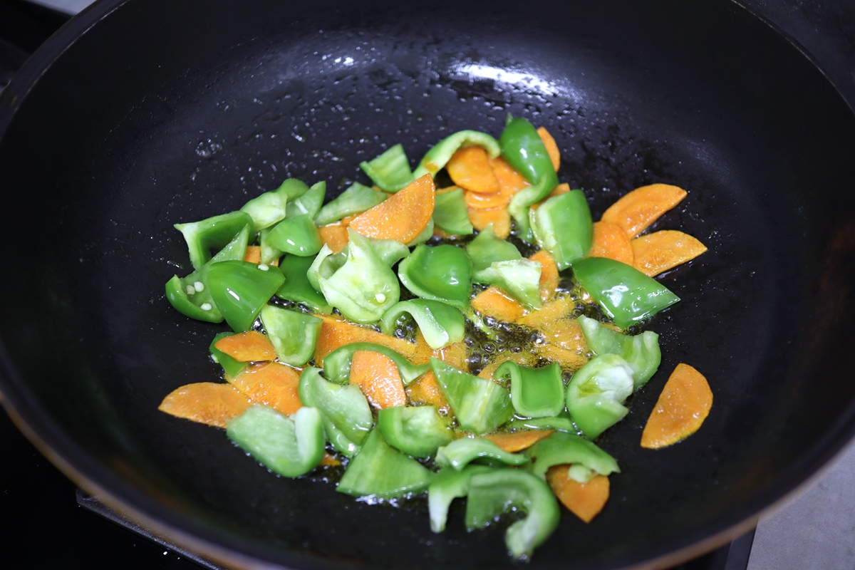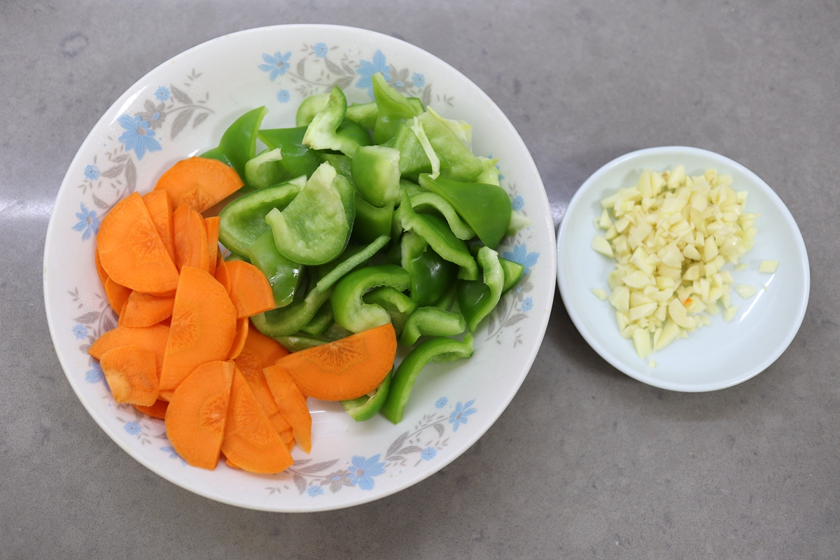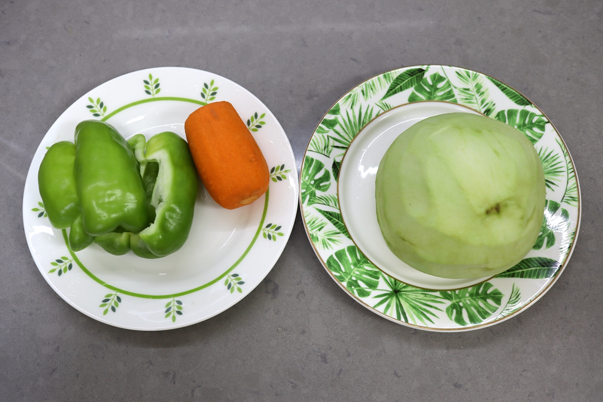 材料:圆茄子1个,青椒1个,胡萝卜半根,普通面粉50克,植物油适量,盐少许,酱油30克,蚝油15克,凉水50克,大蒜5瓣