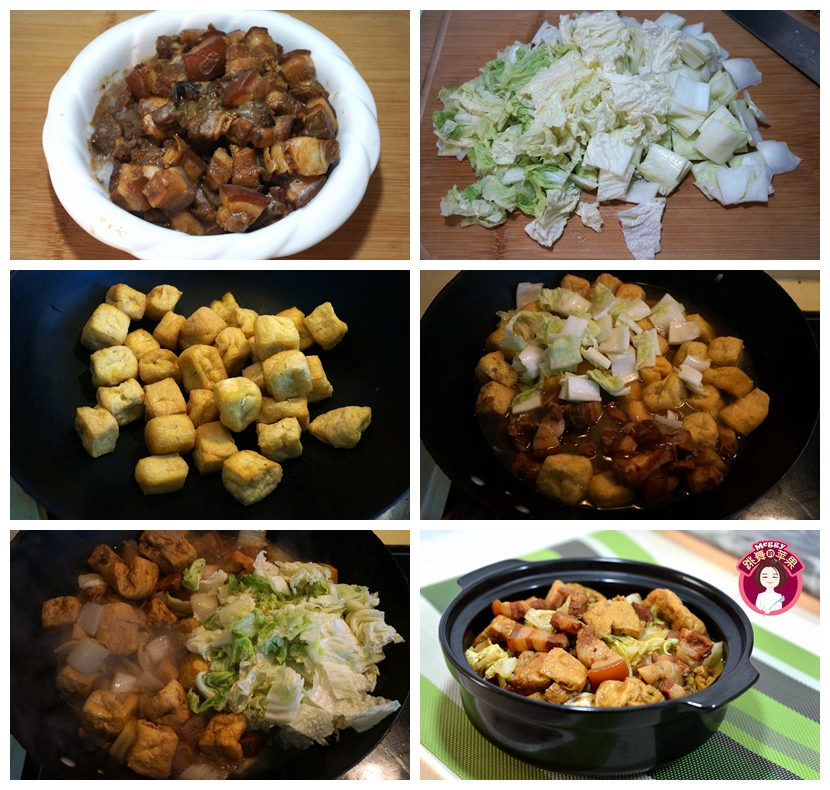 材料:红烧肉一碗,白菜六片,豆泡一碗,盐,酱油
